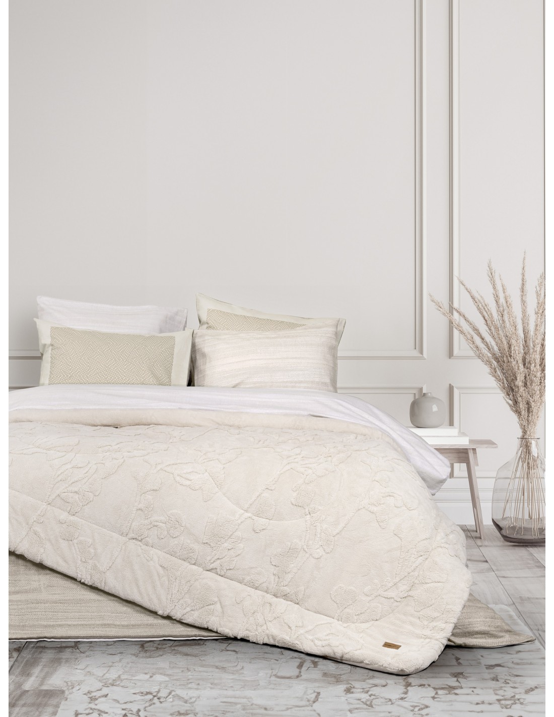 Κουβερτοπάπλωμα με σύνθεση από 100% πολυέστερ. Ένα ζεστό και απαλό πάπλωμα από Sherpa jacquard συνδυασμένη με την απαλή υφή του coral fleece. Ιδανικό για τις κρύες φθινοπωρινές και χειμωνιάτικες νύχτες. Το χαρακτηριστικό του πολυεστερικού υφάσματός του είναι η αντοχή, μιας και μπορεί να διατηρήσει αναλλοίωτο το σχήμα και το χρώμα του για πάρα πολλά χρόνια και μετά από πολλές πλύσεις. Δεν ζαρώνει, ούτε και χρειάζεται ιδιαίτερη φροντίδα. Επιπλέον, ανήκει στα λευκά είδη που δεν προσελκύουν το σκόρο όταν αποθηκεύονται για τους καλοκαιρινούς μήνες. Ιδανικό για να σας προσφέρει ζεστασιά και άνεση στον ύπνο.