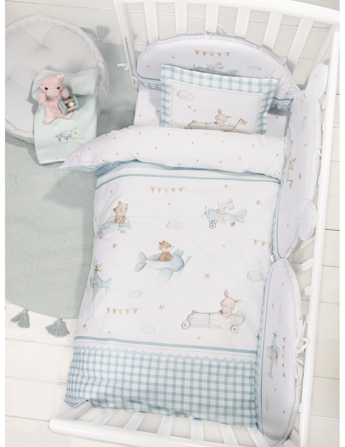 To βαμβακερό σετ παπλωματοθήκης Joy Ride απεικονίζει μια παρέα από χαριτωμένα ζωάκια, που πετούν με τα αεροπλανάκια τους ανάμεσα στα σύννεφα και τα αστεράκια. Τα διακοσμητικά σημαιάκια και οι διάσπαρτοι αστερισμοί προσθέτουν μια γιορτινή και περιπετειώδη ατμόσφαιρα. Το σχέδιο πλαισιώνεται με ένα ενδιαφέρον καρό μοτίβο σε τυρκουάζ αποχρώσεις που τονίζουν το κεντρικό μοτίβο με τα ζωάκια και δημιουργούν ένα πλούσιο οπτικό αποτέλεσμα. Η πάνελ μαξιλαροθήκη δίνει μια επιπλέον χαριτωμένη πινελιά. Το σετ διαθέτει αρμονικούς χρωματικούς συνδυασμούς από απαλό γαλάζιο, λευκό και μπεζ. Ετοιμαστείτε για ένα ονειρεμένο ταξίδι στον κόσμο της φαντασίας με τα βρεφικά προϊόντα που μπορούν να συνοδεύσουν το σετ παπλωματοθήκης Joy Ride. Η πάντα, το κουβερλί η κουβέρτα εμπνεύουν για γλυκά όνειρα, ενώ οι πετσετούλες το μπουρνουζάκι και η κάπα, συμβάλλουν σε χαρούμενες στιγμές προσωπικής υγιεινής και φροντίδας!