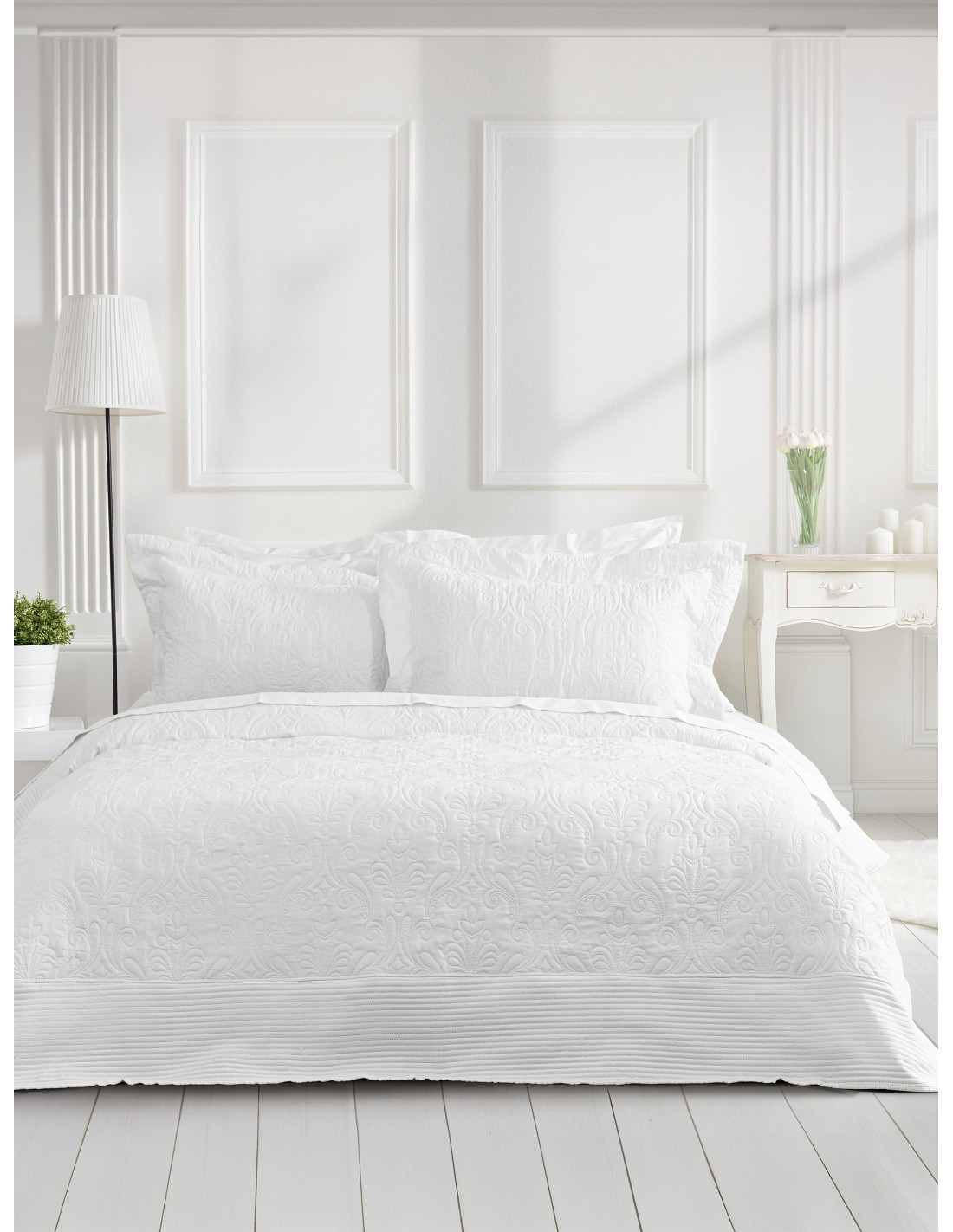 Το σετ κουβερλί Harmony White μπορεί να στολίσει το κρεβάτι σας για κάθε ιδιαίτερη στιγμή με καλαισθησία και άνεση. Ένα διαχρονικό σετ σε λευκό χρώμα, φιλοτεχνημένο με ανάγλυφο σχέδιο τύπου Arabesque θα δώσει μια αίσθηση ρομαντισμού και μυστηρίου ταυτόχρονα. Οι μαξιλαροθήκες του είναι Oxford τεσσάρων πλευρών με περιμετρική γραμμική μπορντούρα και χαρίζουν ένα "πλούσιο" στρώσιμο. Αυτό το τόσο υπέροχο σετ θα δώσει στον χώρο κομψότητα και μια αίσθηση διακριτικής πολυτέλειας. Συμπληρώστε την όμορφη εικόνα με τo λευκό σετ σεντονιών Forever, για να έχετε ένα άψογο και αισθητικά άρτιο αποτέλεσμα.