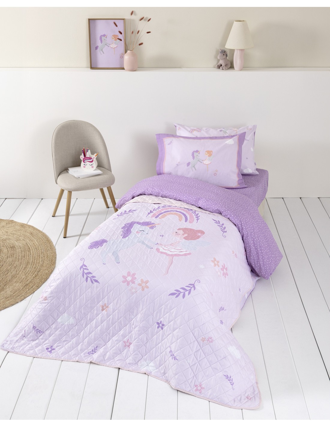 Παιδικό κουβερλί σε ροζ/λιλά χρώμα με παραμυθένιο σχέδιο. Είναι κατασκευασμένο σε τυπωτό ύφασμα 100% microfiber με γέμιση από πολυεστερική βάτα 85 gsm.Το απαλό microfiber ύφασμα και η ελαφριά γέμιση προσφέρουν ιδανική θερμοκρασία για άνετο και ξεκούραστο ύπνο κάθε βράδυ.