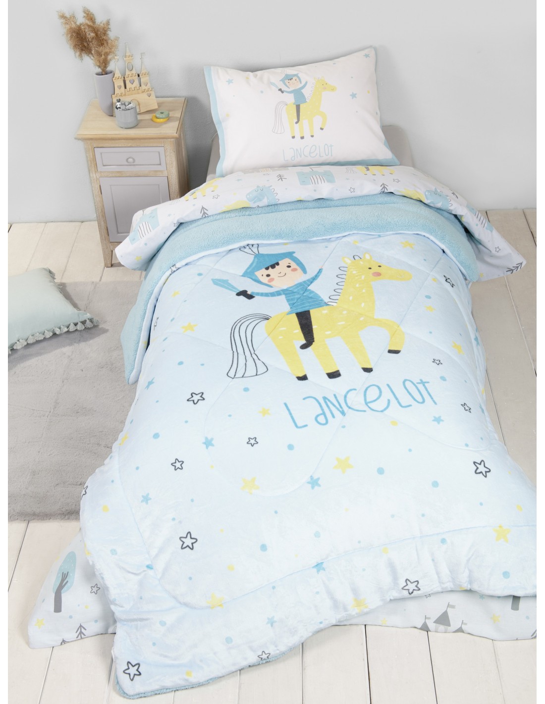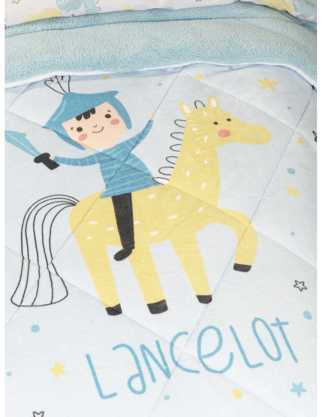 Το παιδικό κουβερτοπάπλωμα Lancelot είναι ο απόλυτος σύμμαχος για να χαρίσετε στο παιδί σας έναν ονειρικό ύπνο. Έχει πάνελ σχέδιο, εμπνευσμένο από τον μαγικό κόσμο των ιπποτών, δοσμένο με απλές γραμμές, σαν να είναι σχεδιασμένο από μικρό καλλιτέχνη! Ένας γενναίος ιππότης με το άλογό του είναι το κεντρικό θέμα, ενώ διακοσμητικά αστεράκια γεμίζουν την υπόλοιπη επιφάνεια του κουβερτοπαπλώματος. Η χρωματική του παλέτα κινείται σε απαλούς τόνους του γαλάζιου, τιρκουάζ και του φωτεινού κίτρινου. Φτιαγμένο από εξαιρετικά απαλά υλικά, έχει υφή του θυμίζει αγκαλιά. Δημιουργήστε ένα παραμυθένιο σκηνικό στο παιδικό δωμάτιο με το κουβερτοπάπλωμα Lancelot, που συνδυάζει ζεστασιά, άνεση και μοναδικό στυλ. Το τέλειο δώρο για κάθε μικρό ιππότη!