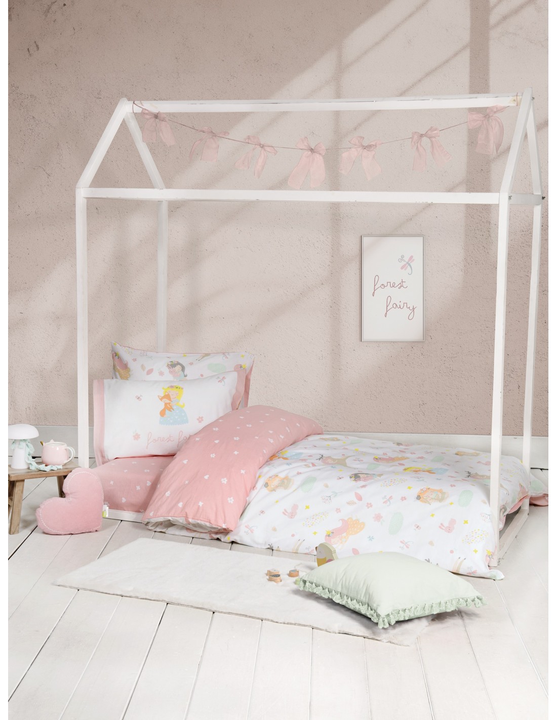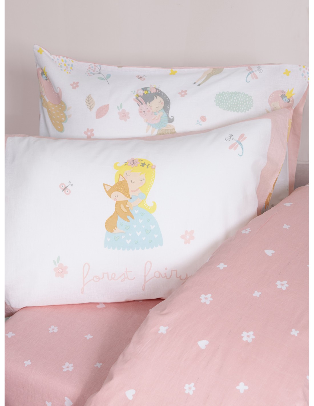 Το σετ παπλωματοθήκης Forest Fairy διαθέτει ένα παραμυθένιο σχέδιο με χαριτωμένες πολύχρωμες πριγκίπισσες που παίζουν με αγαπημένα ζωάκια του δάσους. Η δεύτερη όψη της, έχει λιτό επαναλαμβανόμενο μοτίβο με μικροσκοπικές καρδούλες και λουλουδάκια, πάνω σε ροζ φόντο, που κάνει μια όμορφη αντίθεση με το πολύχρωμο σχέδιο της πάνω πλευράς. Σας δίνεται λοιπόν η επιλογή στρωσίματος, ώστε να έχετε δύο διαφορετικές εικόνες στο παιδικό δωμάτιο. Η πάνελ μαξιλαροθήκη του σετ έχει ένα ξεχωριστό σχέδιο με μια πριγκίπισσα αγκαλιά με το αγαπημένο της ζωάκι, που συμπληρώνει ιδανικά το παραμυθένιο θέμα. Αυτό το παιδικό σετ παπλωματοθήκης είναι σχεδιασμένο για να δημιουργήσει έναν κόσμο γλυκύτητας και ηρεμίας στο παιδικό δωμάτιο. Τα απαλά χρώματα και το χαριτωμένο σχέδιο προσφέρουν μια αίσθηση ζεστασιάς για το μικρό σας. Συνδυάστε το σετ παπλωματοθήκης Forest Fairy με άλλα προϊόντα της σειράς, όπως τις ασορτί μαξιλαροθήκες ή το σετ σεντονιών, για ένα πραγματικά παραμυθένιο δωμάτιο!