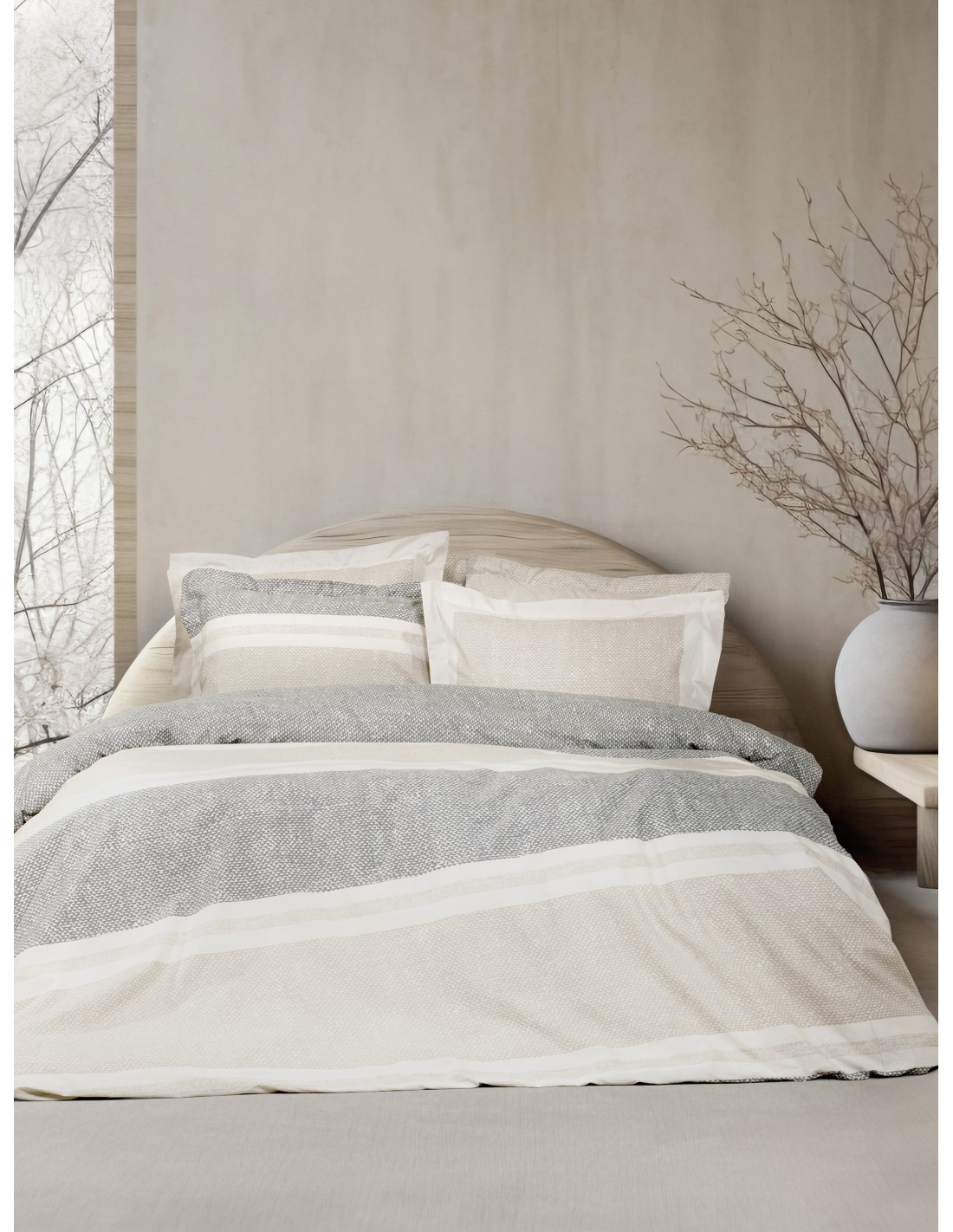 Το σετ βαμβακερής παπλωματοθήκης Lido συνδυάζει την κλασική κομψότητα με μια μοναδική, σύγχρονη προσέγγιση. Το σχέδιό του χαρακτηρίζεται από καθαρές γραμμές σε οριζόντιες ρίγες, οι οποίες φιλοξενούν στο εσωτερικό τους μια πλούσια υφή που θυμίζει όψη καμβά. Αυτή η λεπτομέρεια δίνει στο προϊόν μια αίσθηση φυσικότητας και βάθους, ενώ η συνολική αρμονία των χρωμάτων του μπεζ, του γκρι και του λευκού, δημιουργεί μια ήρεμη και φιλόξενη ατμόσφαιρα. Το σετ εμπλουτίζεται με τις oxford μαξιλαροθήκες που έχουν λιτό πάνελ μοτίβο στην μία τους όψη, ενώ στη δεύτερη όψη τους επαναλαμβάνεται το σχέδιο του πανωσέντονου. Επιλέγοντας το σετ παπλωματοθήκης Lido δημιουργείτε έναν ποιοτικό και στιλάτο χώρο, που θα σας εξασφαλίσει την καθημερινή σας ξεκούραση.