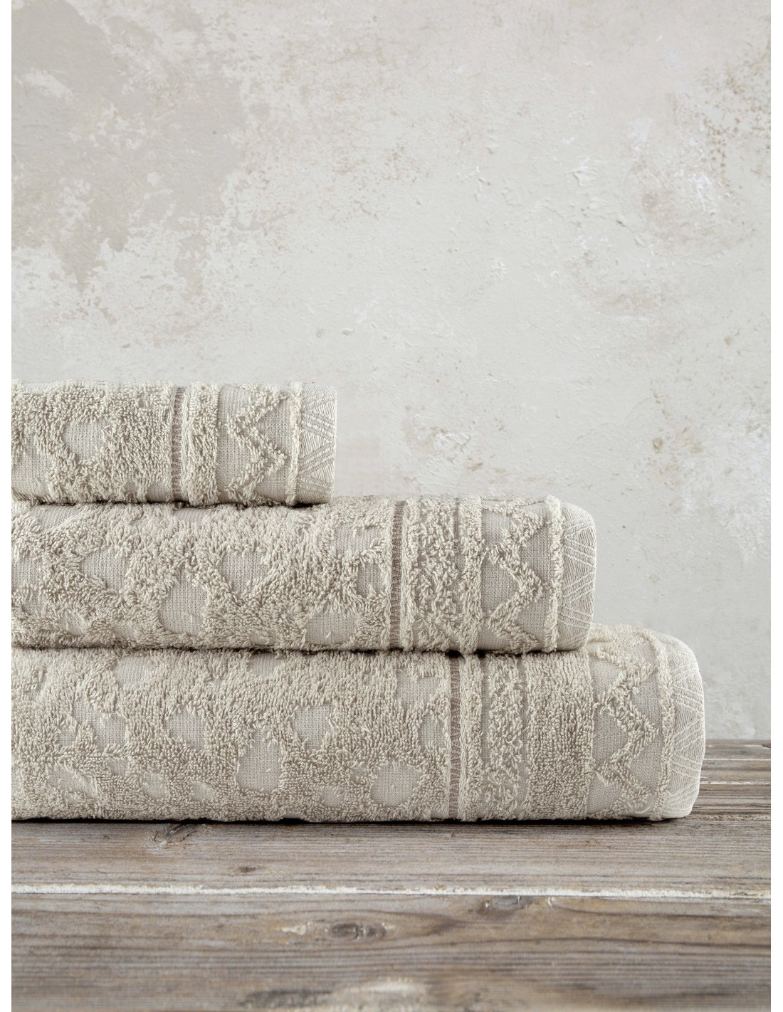 Σετ Πετσέτες Jacquard 3 τεμαχίων με σύνθεση από 100% βαμβάκι βάρους 450 gsm. Έχει πλούσια, αφράτη υφή και εξαιρετικά απαλή αίσθηση. Χάρη στη βαμβακερή της σύνθεση αναπνέει φυσικά, είναι πολύ απορροφητική, υποαλλεργική και φιλική προς το δέρμα. Προσφέρει άνετο στέγνωμα μετά το ντους ή το μπάνιο. Είναι ιδανική για καθημερινή χρήση και έχει μεγάλη αντοχή στον χρόνο καθώς διατηρεί το σχήμα και το χρώμα της ακόμα και μετά από πολλές πλύσεις, χωρίς να απαιτεί ιδιαίτερη φροντίδα.