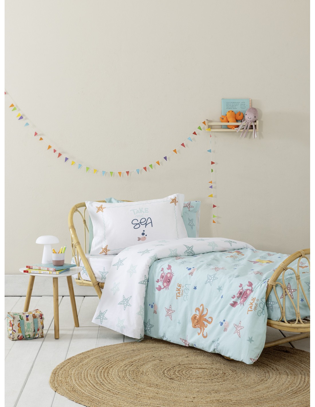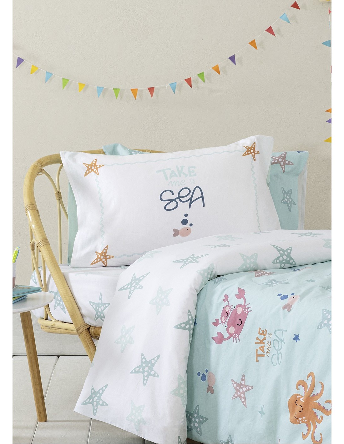 Τα παιδικά βαμβακερά σεντόνια Take me to the Sea αποτυπώνουν τον βυθό της θάλασσας γεμάτο χαρά & παιχνίδι. Ένα παιχνιδιάρικο σκηνικό, όπου χαρούμενα καβούρια και χταπόδια στροβιλίζονται ανάμεσα σε αστερίες, προσκαλεί σε υποβρύχιες περιπέτειες, δημιουργώντας μια ατμόσφαιρα χαράς και φαντασίας. Η πανέλ μαξιλαροθήκη διαθέτει ένα μοναδικό σχέδιο με την επιγραφή "Take me to the Sea" και διακριτικά θαλασσινά μοτίβα, που συμπληρώνει ιδανικά το θαλασσινό θέμα του σετ. Το σετ σεντόνια "Take Me to the Sea" διατίθεται σε απαλό τιρκουάζ χρώμα με πολύχρωμες φιγούρες, που θυμίζει τα κρυστάλλινα νερά της θάλασσας. Το χρώμα εναρμονίζεται άψογα με το θέμα και φέρνει μια αίσθηση καλοκαιρινής διάθεσης. Συνδυάστε το με το ασορτί κουβερλί και τις extra μαξιλαροθήκες του σχεδίου, για να έχετε μια ολοκληρωμένη καλοκαιρινή εικόνα στο παιδικό δωμάτιο.