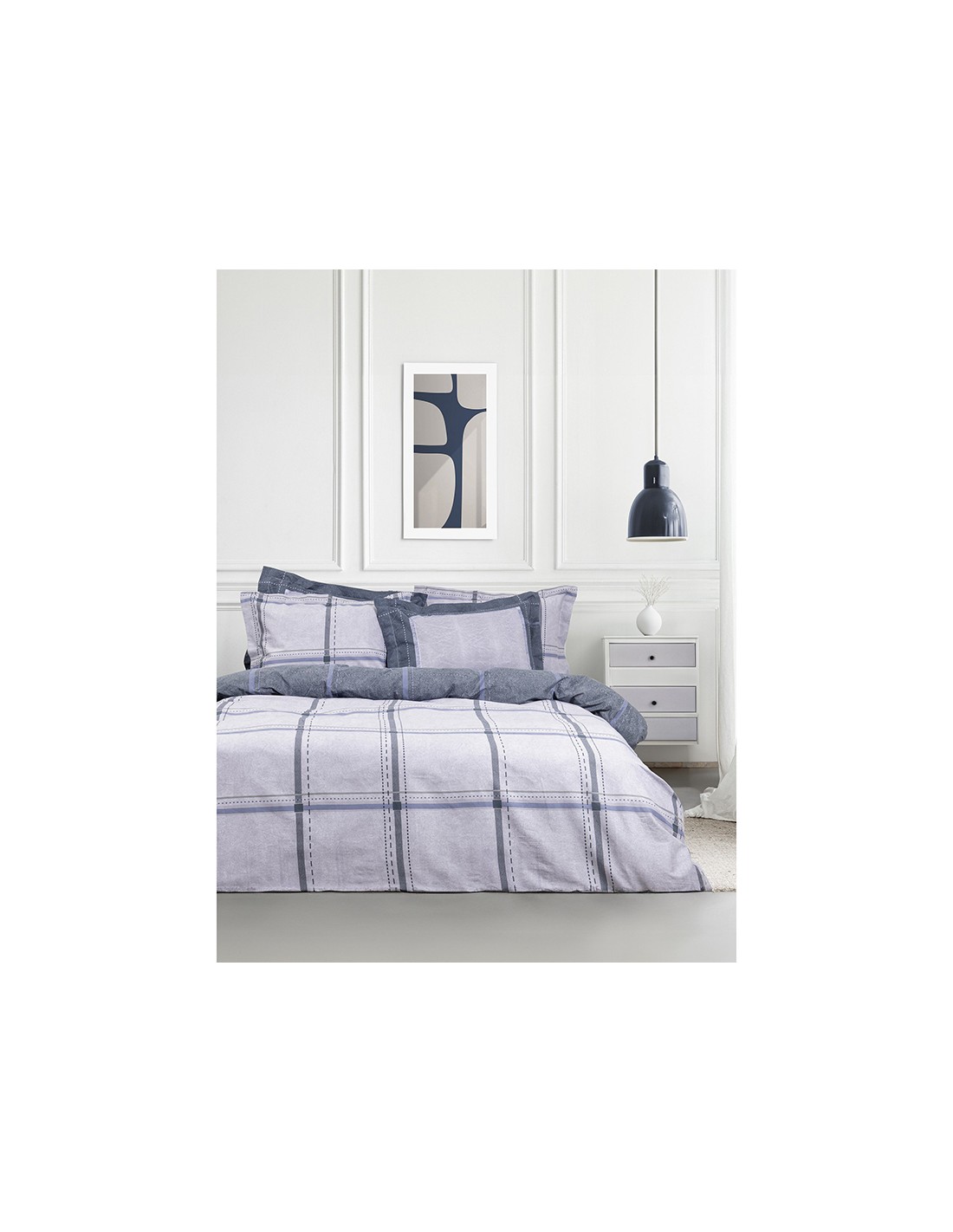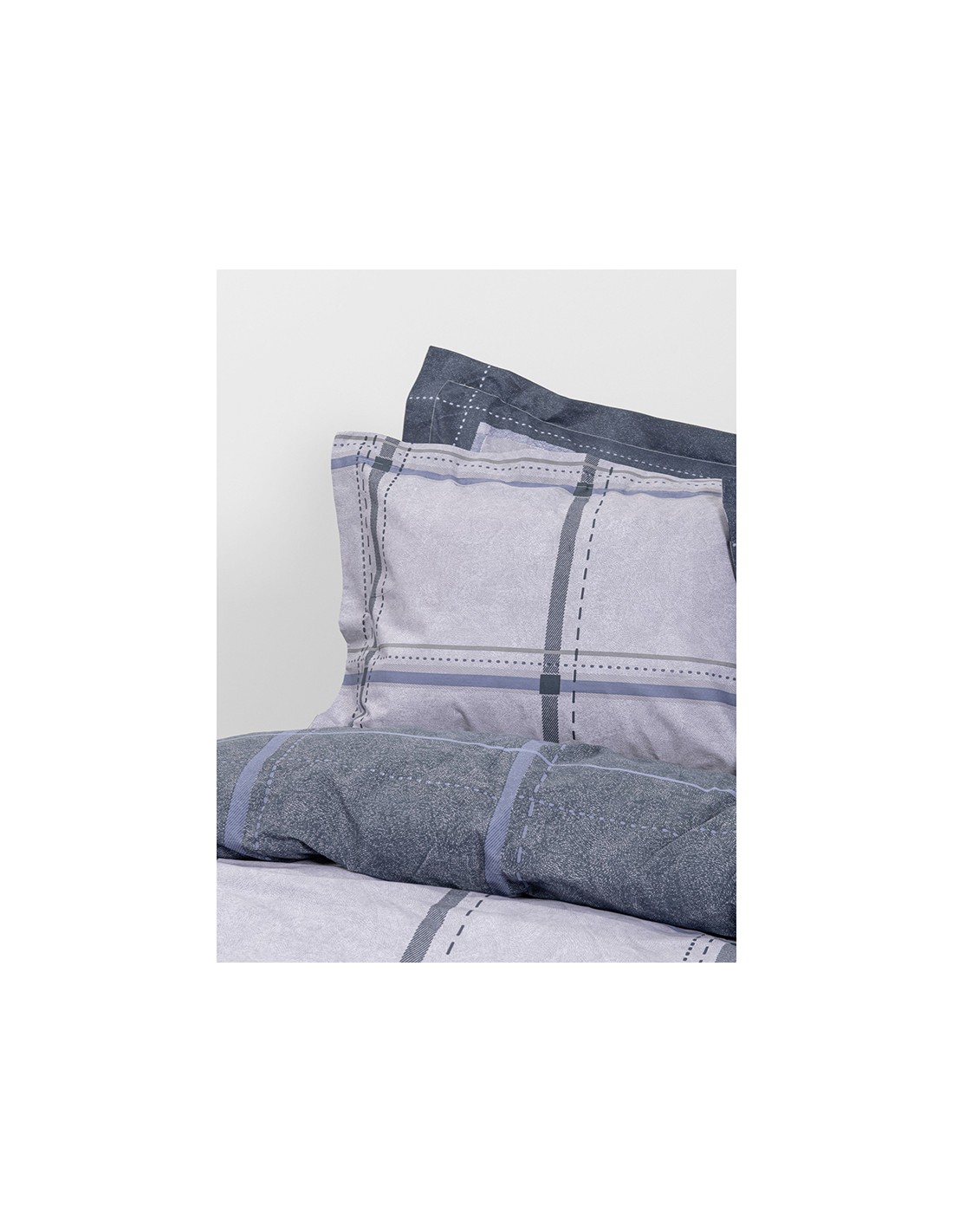 Τό βαμβακερό σετ σεντονιών Whilow είναι κάτι περισσότερο από ένα απλό λευκό είδος, είναι μια δήλωση στυλ που συνδυάζει την τέχνη με την απόλυτη άνεση. Το μοτίβο του είναι μια σύγχρονη σύνθεση που θυμίζει έναν αφηρημένο καμβά. Οι γραμμές ενός κλασικού καρό σχεδίου αποκτούν μια ανάγλυφη, σχεδόν "ζωγραφική" υφή σε μια παλέτα από παγωμένο γκρι - μπλε και απαλό γκρι. Αυτή η καλλιτεχνική πινελιά δίνει στο σχέδιο βάθος και χαρακτήρα. Πλουτίζεται με τις oxford μαξιλαροθήκες που έχουν λιτό πάνελ μοτίβο στην μία τους όψη, ενώ στη δεύτερη όψη τους επαναλαμβάνεται το σχέδιο του πανωσέντονου. Επιλέγοντας το σετ σεντονιών Whillow δημιουργείτε έναν ποιοτικό και στιλάτο χώρο, ικανό να σας εξασφαλίσει την καθημερινή σας ξεκούραση.