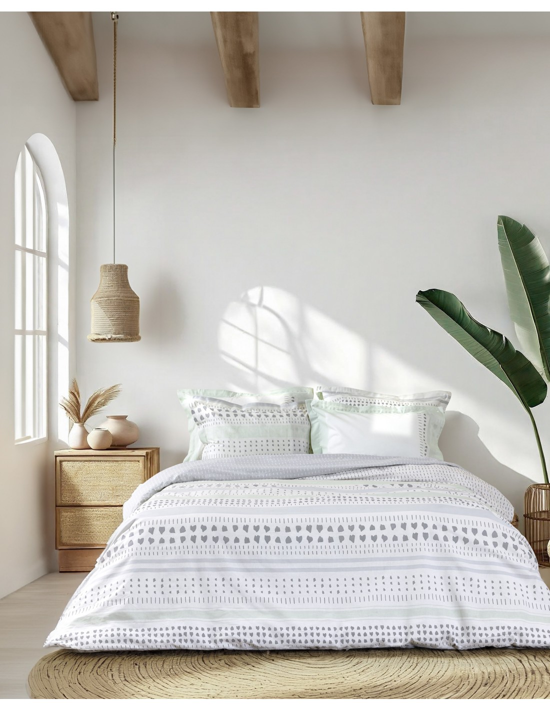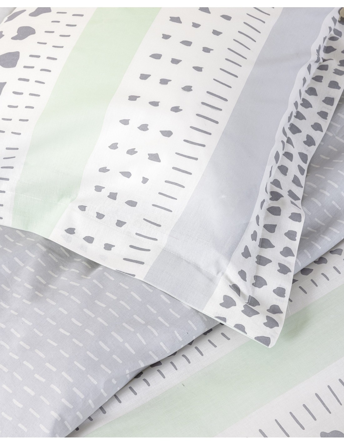 Σετ σεντόνια σε γκρι - μέντα χρώμα με μοντέρνο σχέδιο. Είναι κατασκευασμένα από 100% βαμβάκι 144 κλωστών, που τα καθιστά απαλά, ανθεκτικά και άνετα στη χρήση. Οι μαξιλαροθήκες είναι Oxford 4 πλευρών δύο όψεων – η μία με το σχέδιο του πανωσέντονου και η άλλη σε στις ίδιες αποχρώσεις με πάνελ διακριτικό μοτίβο. Ιδανικό για να ανανεώσει το υπνοδωμάτιο με στυλ και άνεση.