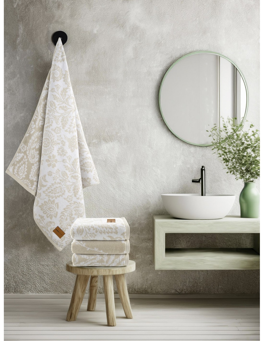 Το βαμβακερό σετ πετσέτες Nasima φέρνει την ατμόσφαιρα της Ανατολής στο μπάνιο σας! Έχει μοναδικό μοτίβο με λαχούρια που είναι μια εξαιρετική επιλογή για όσους εκτιμούν την πλούσια πολιτιστική κληρονομιά και την αίσθηση της ζεστασιάς που προσφέρει. Οι πλούσιες λεπτές καμπύλες των λαχουριών αποδίδονται με μεγάλη λεπτομέρεια λόγω της νηματοβαφής και προσδίδουν μια πινελιά κομψότητας και φινέτσας. Το βελούρ φινίρισμα προσδίδει μια απίστευτη αίσθηση απαλότητας και πολυτέλειας στις πετσέτες, ενώ η χρωματική παλέτα του σετ επικεντρώνεται σε γήινες αποχρώσεις του μπεζ, που δίδει μια αίσθηση ζεστασιάς στο χώρο σας. Ανανεώστε το μπάνιο σας με μια πινελιά ανατολίτικης κομψότητας και διαχρονικού στυλ.