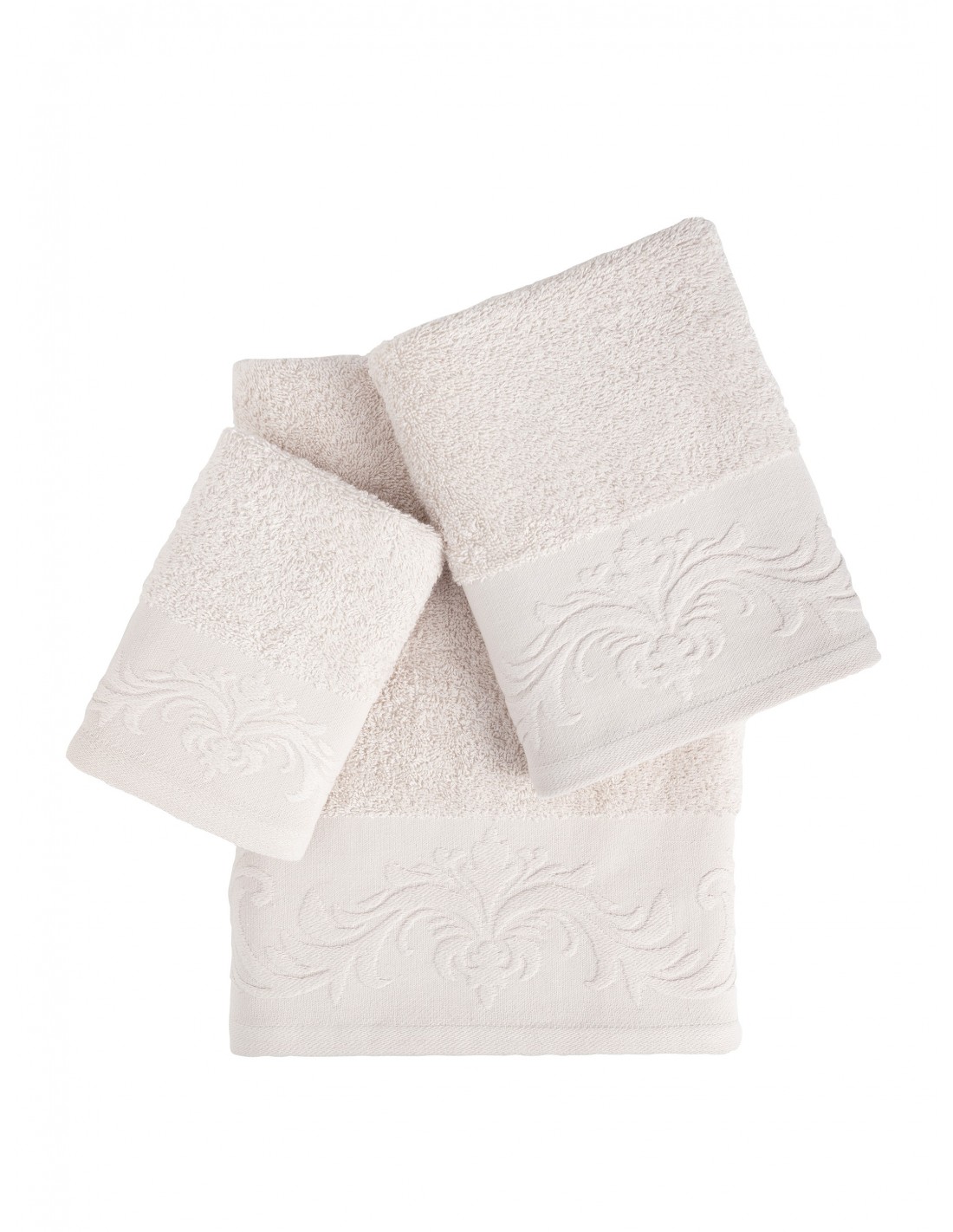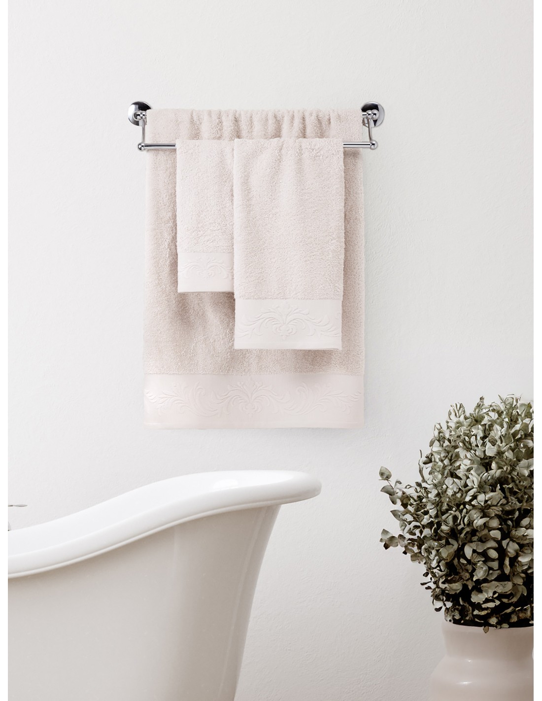 Το βαμβακερό σετ πετσέτας Ambrose Nude έχει σώμα με υπέροχη αφράτη υφή σε μια απαλή nude απόχρωση που θυμίζει την άμμο της ερήμου. Στολίζεται από εκλεπτυσμένη ζακάρ μπορντούρα με floral μοτίβο που προσδίδει μια αίσθηση φυσικής κομψότητας και καλλιτεχνικής φινέτσας στις πετσέτες. Η λεπτομέρεια της μπορντούρας τονίζει την υψηλή ποιότητα κατασκευής και την προσοχή στη λεπτομέρεια. Aποτελούν μια εξαιρετική επιλογή για εσάς που αγαπάτε την minimal αισθητική και τις γήινες αποχρώσεις και εναρμονίζονται με κάθε στυλ διακόσμησης. Η συσκευασία τους είναι όμορφη και λιτή, με μια διακριτική κορδέλα, ώστε να την προσφέρετε σαν δωράκι σε αγαπημένους σας φίλους.