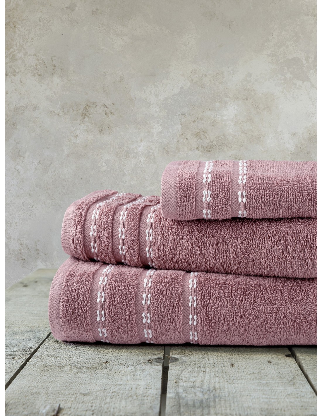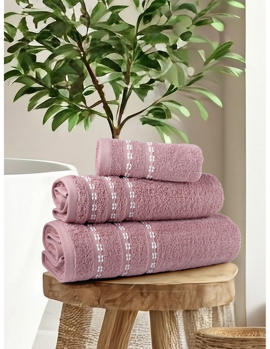Σετ Πετσέτες 3 τεμαχίων με σύνθεση από 100% βαμβάκι βάρους 450 gsm. Έχει πλούσια, αφράτη υφή και εξαιρετικά απαλή αίσθηση. Χάρη στη βαμβακερή της σύνθεση αναπνέει φυσικά, είναι πολύ απορροφητική, υποαλλεργική και φιλική προς το δέρμα. Προσφέρει άνετο στέγνωμα μετά το ντους ή το μπάνιο. Είναι ιδανική για καθημερινή χρήση και έχει μεγάλη αντοχή στον χρόνο καθώς διατηρεί το σχήμα και το χρώμα της ακόμα και μετά από πολλές πλύσεις, χωρίς να απαιτεί ιδιαίτερη φροντίδα.