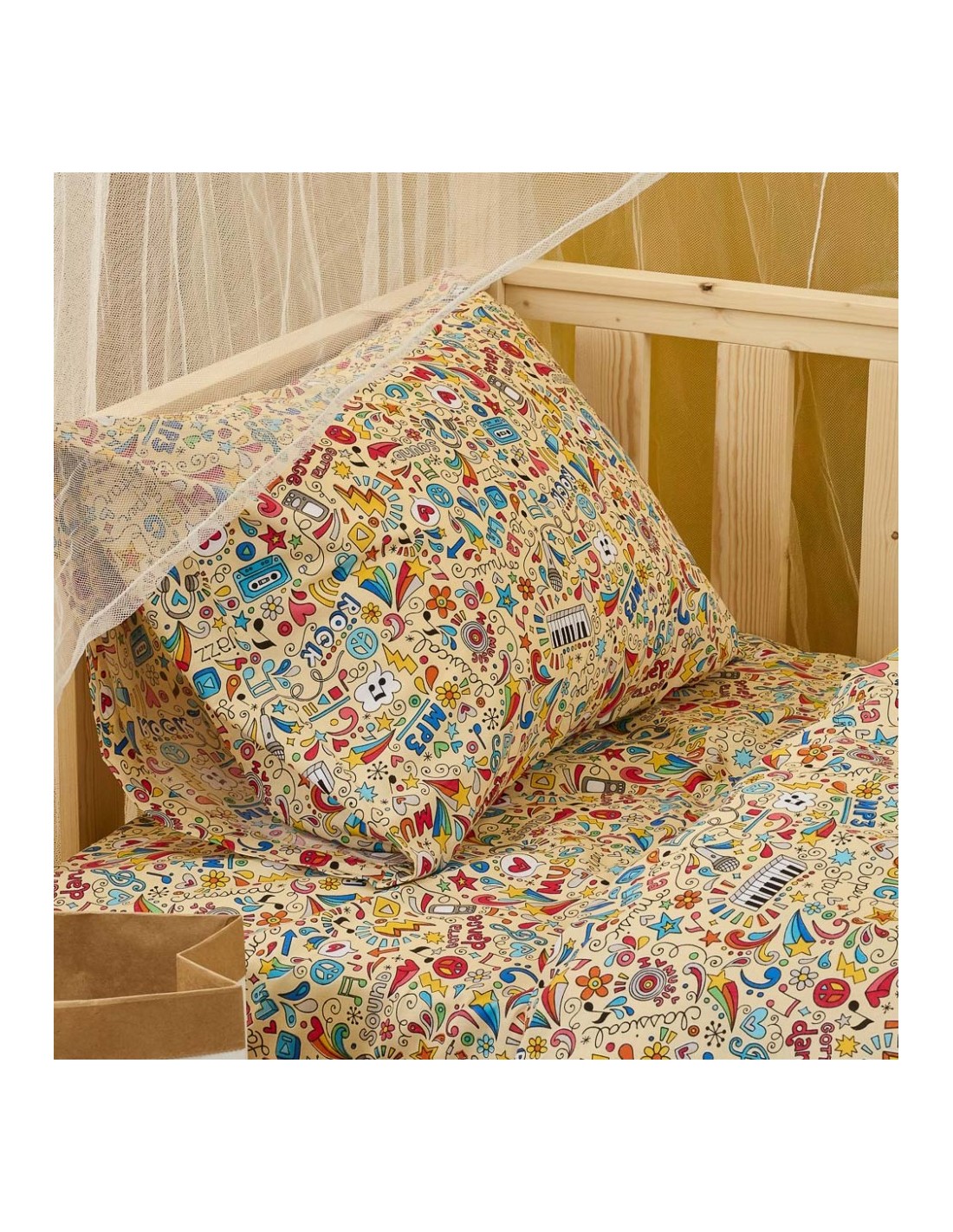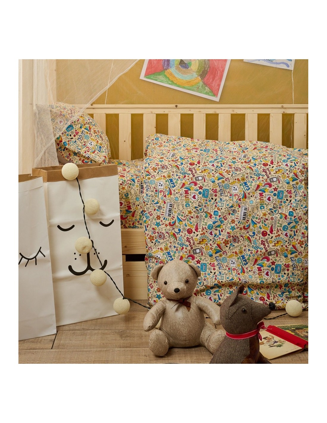 Μεγαλώνετε τους αυριανούς music stars! Αν αγαπάνε την μουσική ας μην την αποχωρίζονται ούτε όταν κοιμούνται. Η βαμβακερή παπλωματοθήκη για παιδιά, Music ακολουθεί τους ρυθμούς τους. Υποαλλεργική, απαλή και πλούσια σε βαμβάκι με άριστης ποιότητας νήματα. Χαρίστε στα παιδιά ύπνο γεμάτο υγεία και ξεκούραση.