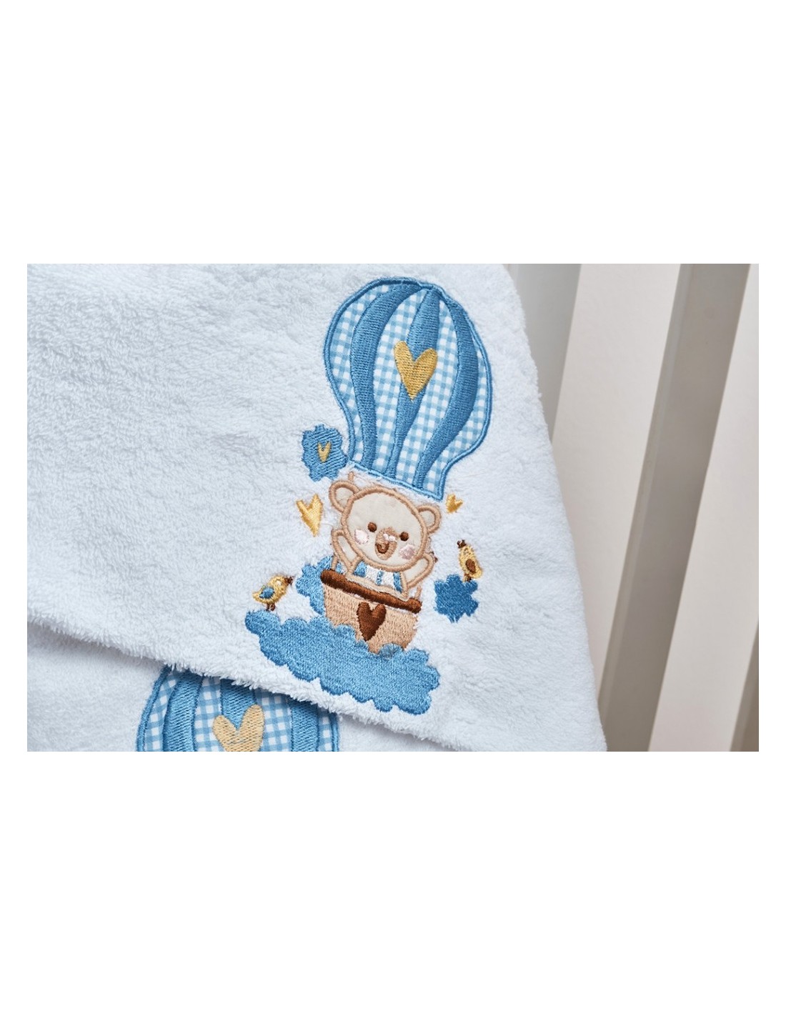 Βαμβακερή Μονόχρωμη Πετσέτα, αφράτη, υποαλλεργική και φιλική στο δέρμα του μωρού, απορροφητική, με κέντημα ένα ταξιδιάρικο μπλε αερόστατο. Συνδυάστε με το αντίστοιχο σετ σεντόνι και χαρίστε στα μικρά σας την καλύτερη φροντίδα.