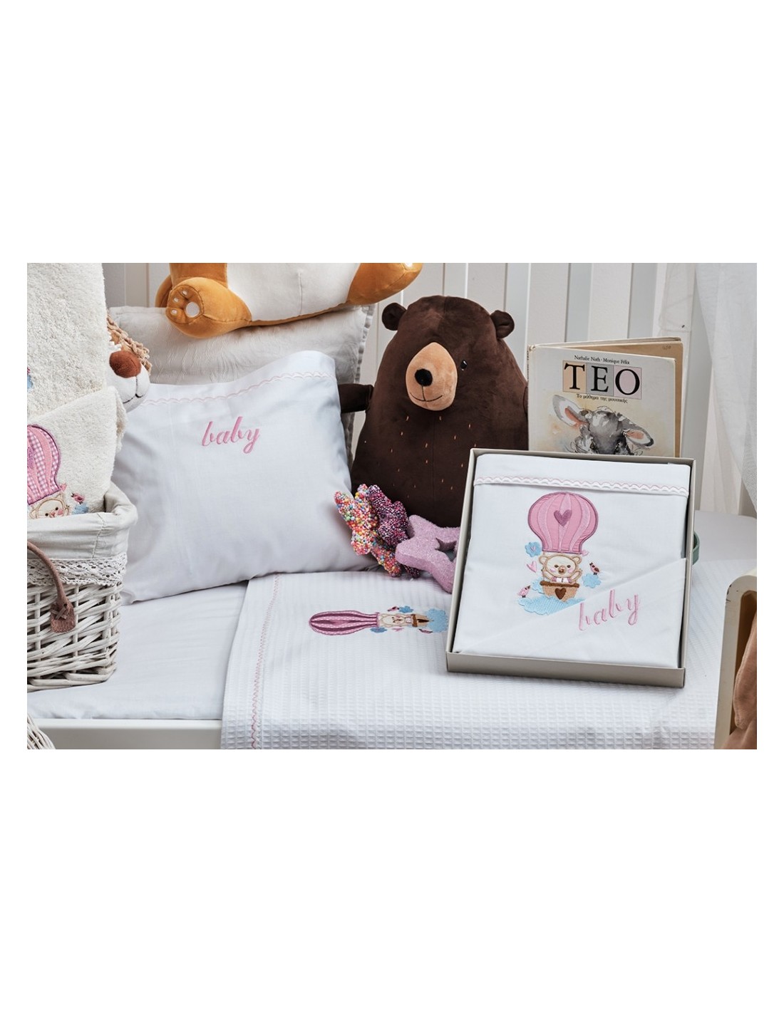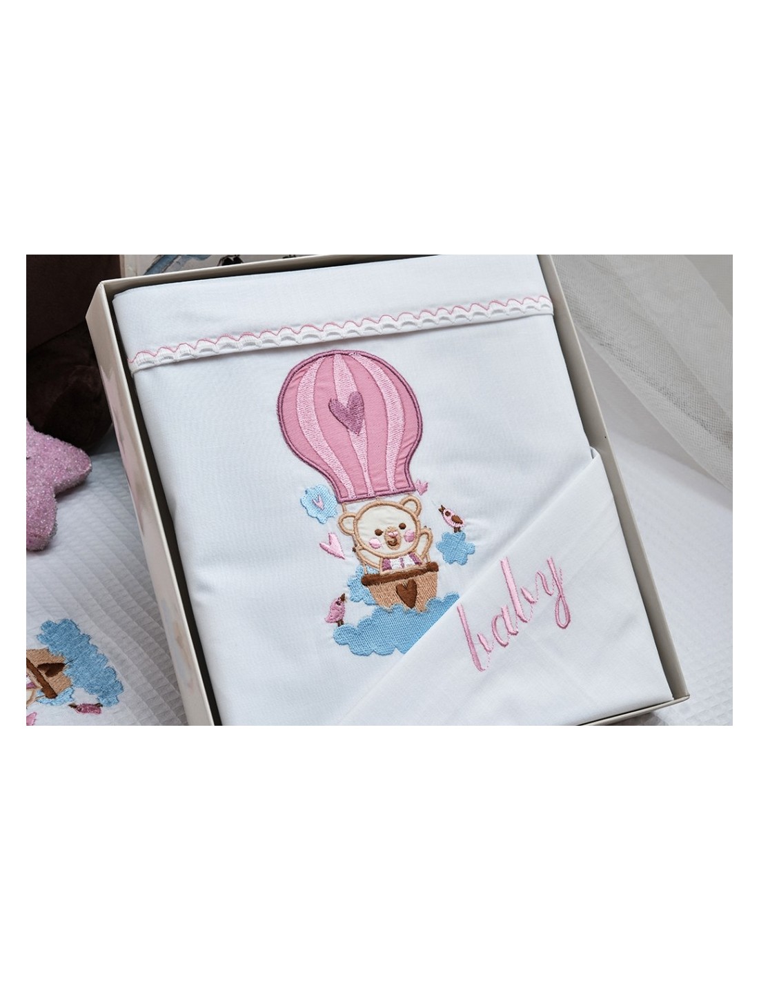 Σετ Βαμβακερών λευκών Σεντονιών για βρέφη, με κέντημα αερόστατο που θα ταξιδέψει το μωρό σας στην παραμυθοχώρα. Υποαλλεργικά κι απαλά για να εξασφαλίζουν υγιή και ξεκούραστο ύπνο στα μικρά αγγελούδια σας.