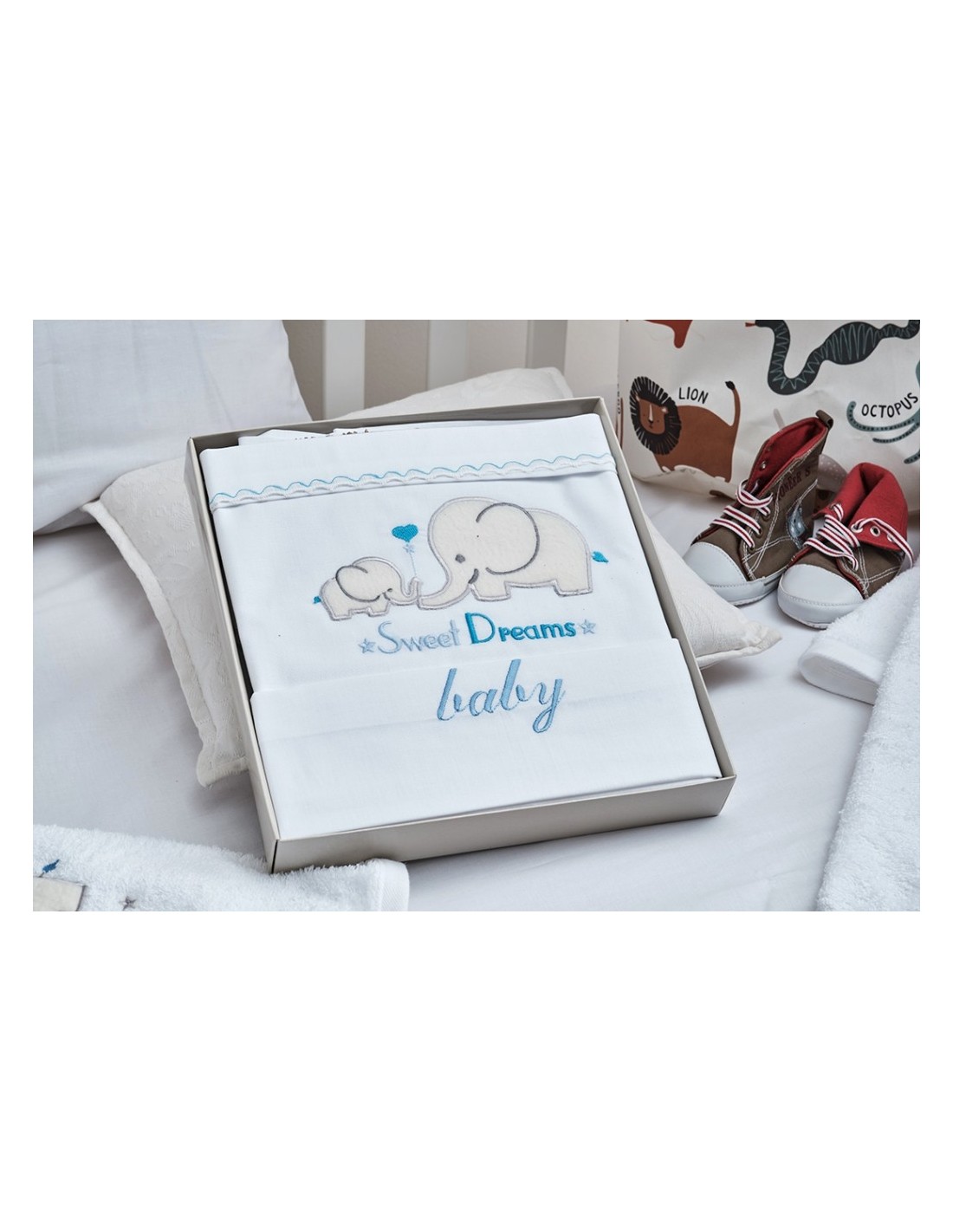 Σετ Βαμβακερών λευκών Σεντονιών για βρέφη, με κέντημα ελεφαντάκια για την πρώτη τους εξερεύνηση. Υποαλλεργικά κι απαλά για να εξασφαλίζουν υγιή και ξεκούραστο ύπνο στα μικρά αγγελούδια σας.