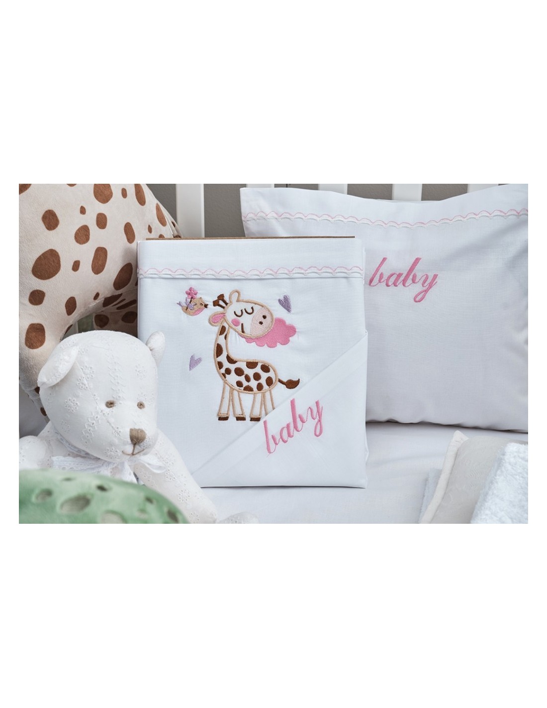 Σετ Βαμβακερών λευκών Σεντονιών για βρέφη, με κέντημα χαριτωμένη καμηλοπάρδαλη που θα τα ταξιδέψει στα μυστικά άλλων ηπείρων. Υποαλλεργικά κι απαλά για να εξασφαλίζουν υγιή και ξεκούραστο ύπνο στα μικρά αγγελούδια σας.