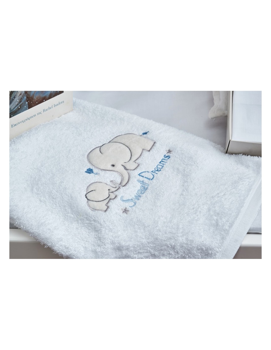Βαμβακερή Μονόχρωμη Πετσέτα, αφράτη, υποαλλεργική και φιλική στο δέρμα του μωρού, απορροφητική, με κέντημα ένα παιχνιδιάρικο μπλε ελεφαντάκι. Συνδυάστε με το αντίστοιχο σετ σεντόνι και χαρίστε στα μικρά σας την καλύτερη φροντίδα.