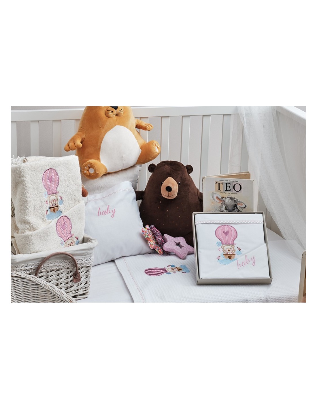 Βαμβακερή Μονόχρωμη Πετσέτα, αφράτη, υποαλλεργική και φιλική στο δέρμα του μωρού, απορροφητική, με κέντημα ένα ταξιδιάρικο ροζ αερόστατο. Συνδυάστε με το αντίστοιχο σετ σεντόνι και χαρίστε στα μικρά σας την καλύτερη φροντίδα.