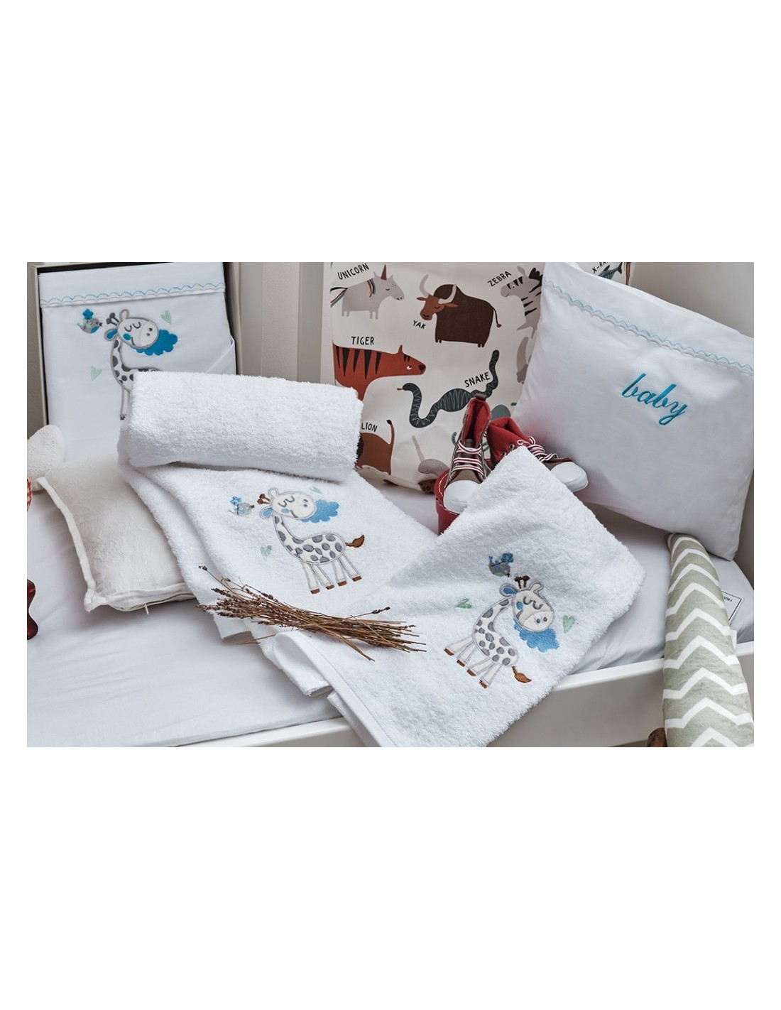 Βαμβακερή Μονόχρωμη Πετσέτα, αφράτη, υποαλλεργική και φιλική στο δέρμα του μωρού, απορροφητική, με κέντημα μια γλυκιά μπλε καμηλοπάρδαλη από τις μακρινές σαβάνες. Συνδυάστε με το αντίστοιχο σετ σεντόνι και χαρίστε στα μικρά σας την καλύτερη φροντίδα.