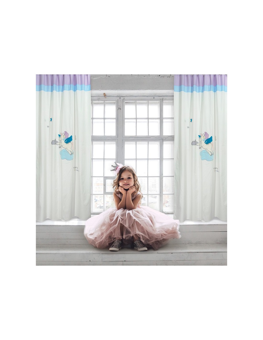 Κουρτίνα με κρίκους ανάρτησης, σε ύφασμα 100% βαμβάκι, μέτριας σκίασης με κέντημα. Ιδανική για παιδικό υπνοδωμάτιο. Η διάσταση της είναι 140Χ260. Προτείνεται πριν την αλλαγή του μήκους, η κουρτίνα να πλένεται.