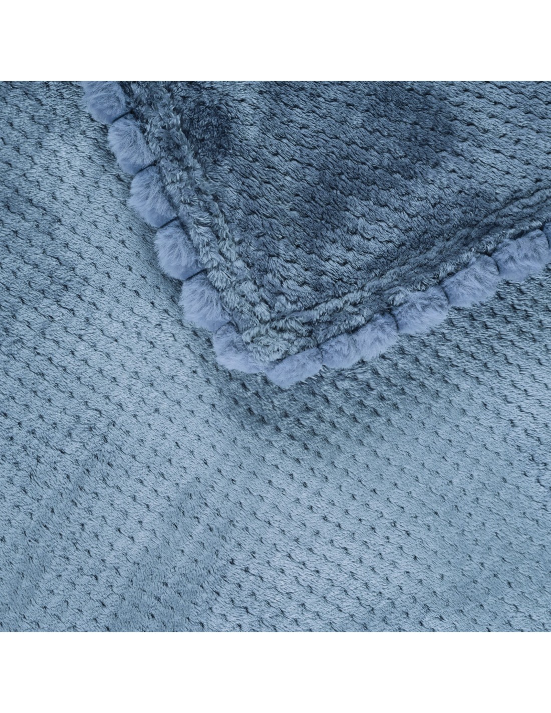 Κουβέρτα μονόχρωμη fleece με ανάγλυφο σχέδιο και pom-pom στις 3 πλευρές. Είναι απο 100% polyester, με βάρος 330gr/m², υποαλλεργική, ιδιαίτερα ζεστή, απαλή στην υφή και έχει μεγάλη αντοχή στη χρήση. Διατίθεται σε διάσταση 160X220εκ. Das home...makes your house a home!