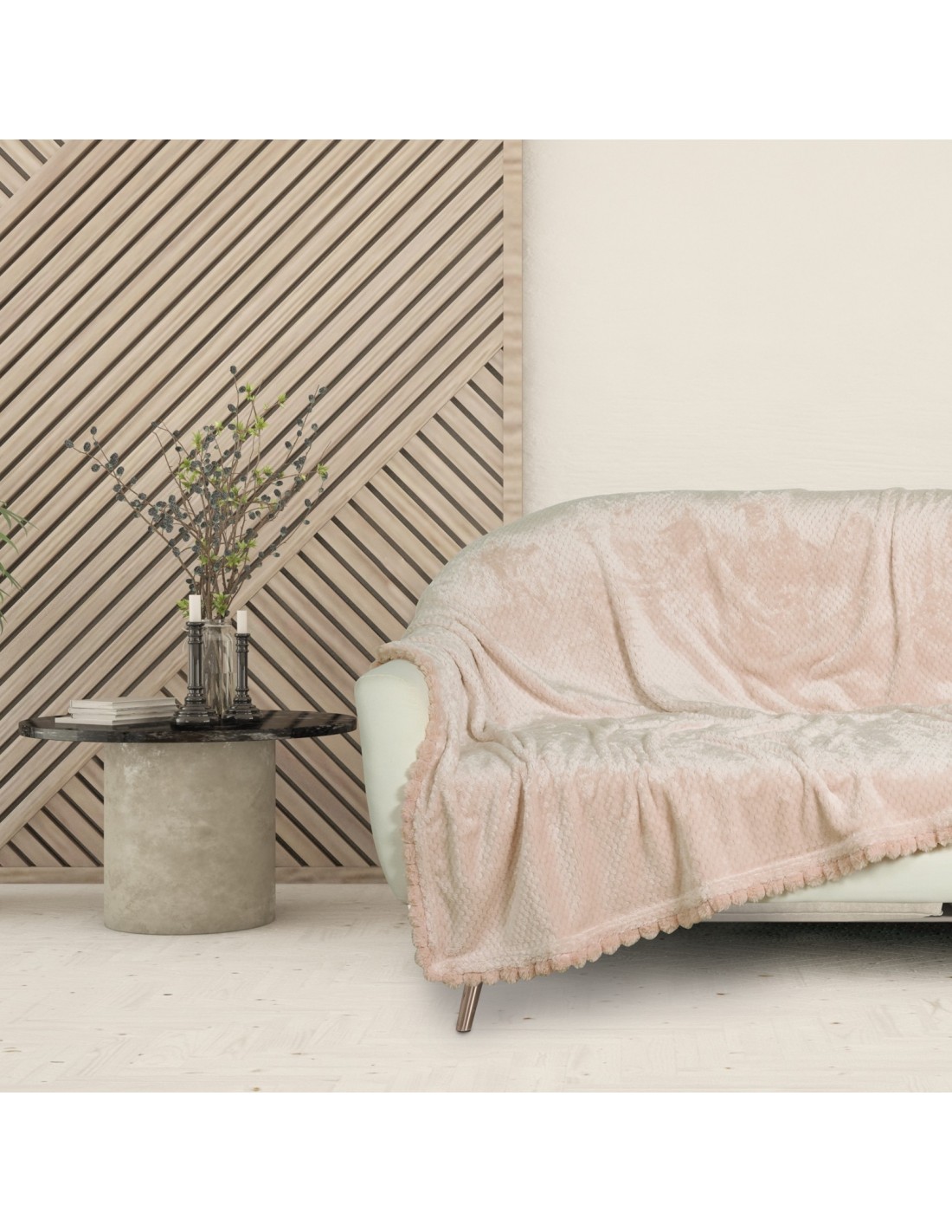 Κουβέρτα μονόχρωμη fleece με ανάγλυφο σχέδιο και περιμετική φάσα με pom-pom. Είναι απο 100% polyester, βάρους 330gr/m², υποαλλεργική, ιδιαίτερα ζεστή και απαλή στην υφή και μεγάλη αντοχή. Διατίθεται σε διάσταση 130X170εκ. Das home...makes your house a home!