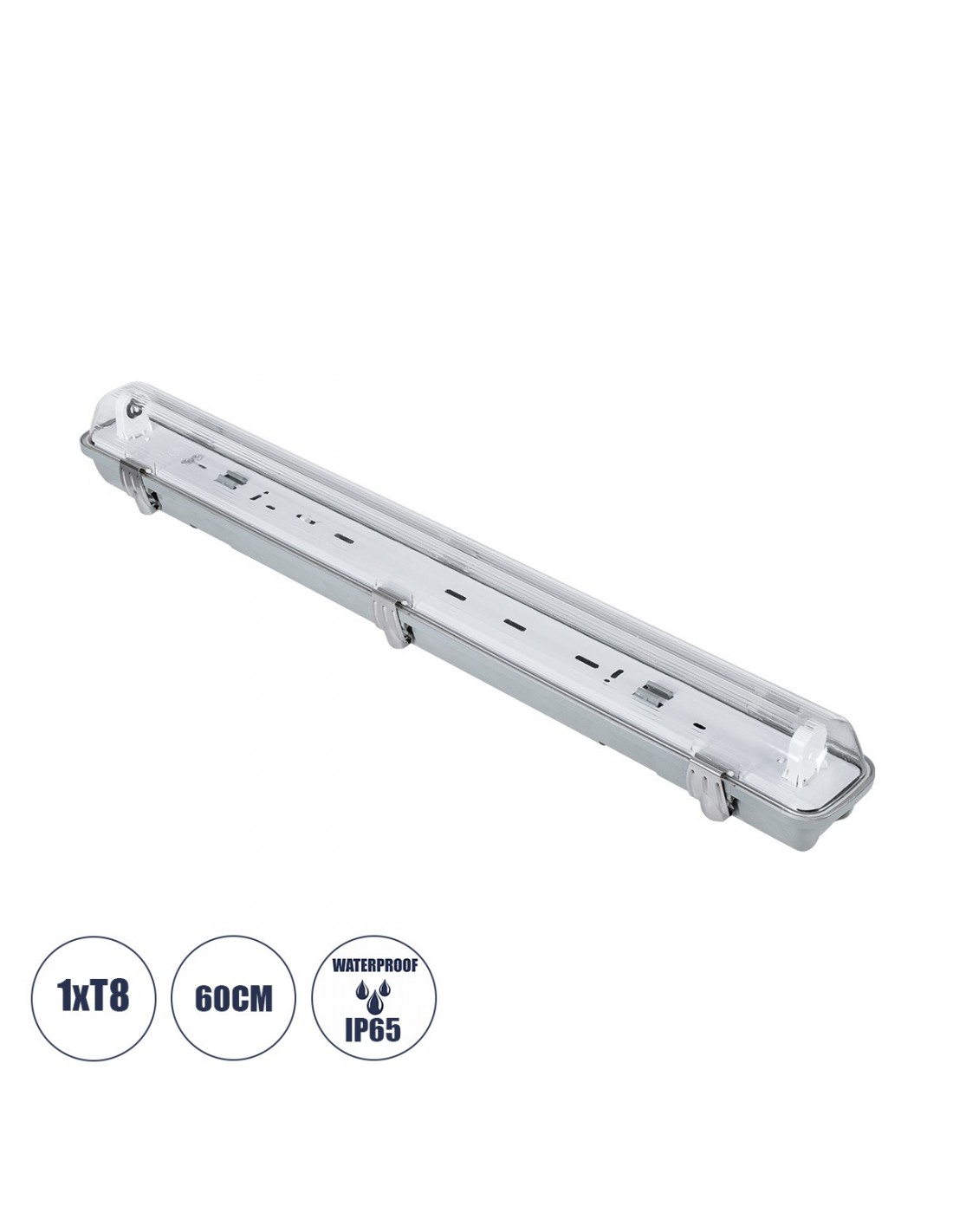 GloboStar® 90610 60cm Tri-Proof Πλαστικό PC Σκαφάκι με Μεταλλικά Clips για 1 x Λάμπες T8 Τύπου Φθορίου LED Τροφοδοσίας Ενός Άκρου Αδιάβροχο IP65
