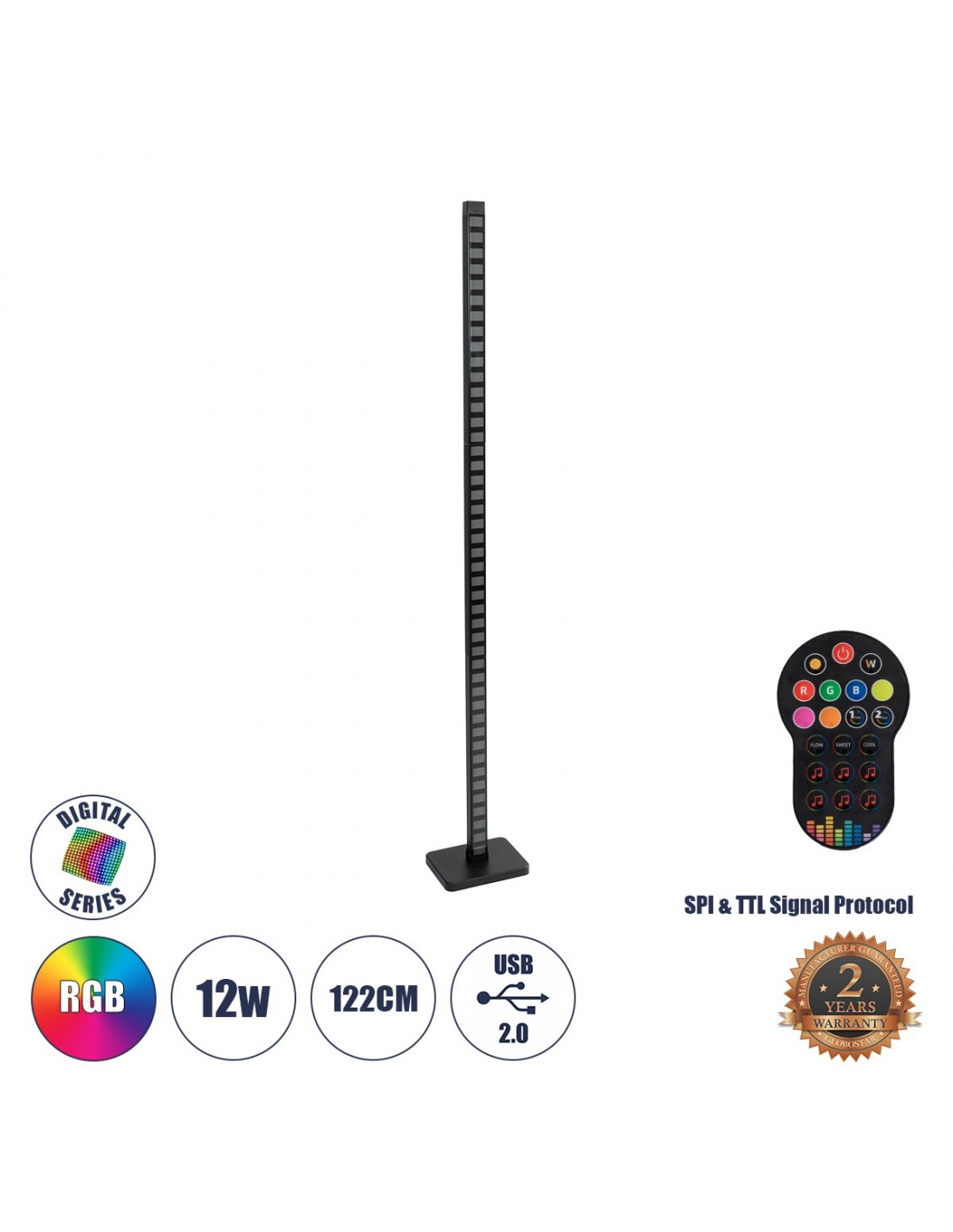 GloboStar® DIGICOLUMN 90762 Μοντέρνο Επιδαπέδιο Φωτιστικό Γραφείου Digital Pixel Rhythm Music Bar LED 12W 960lm 90° DC 5V με USB 2.0 IP20 - Εναλλαγή Φωτισμού μέσω Τηλεχειριστηρίου - Πολύχρωμο RGB - Dimmable - Μαύρο - Μ3.4 x Π2.5 x Υ122cm - 2 Χρόνια Εγγύηση