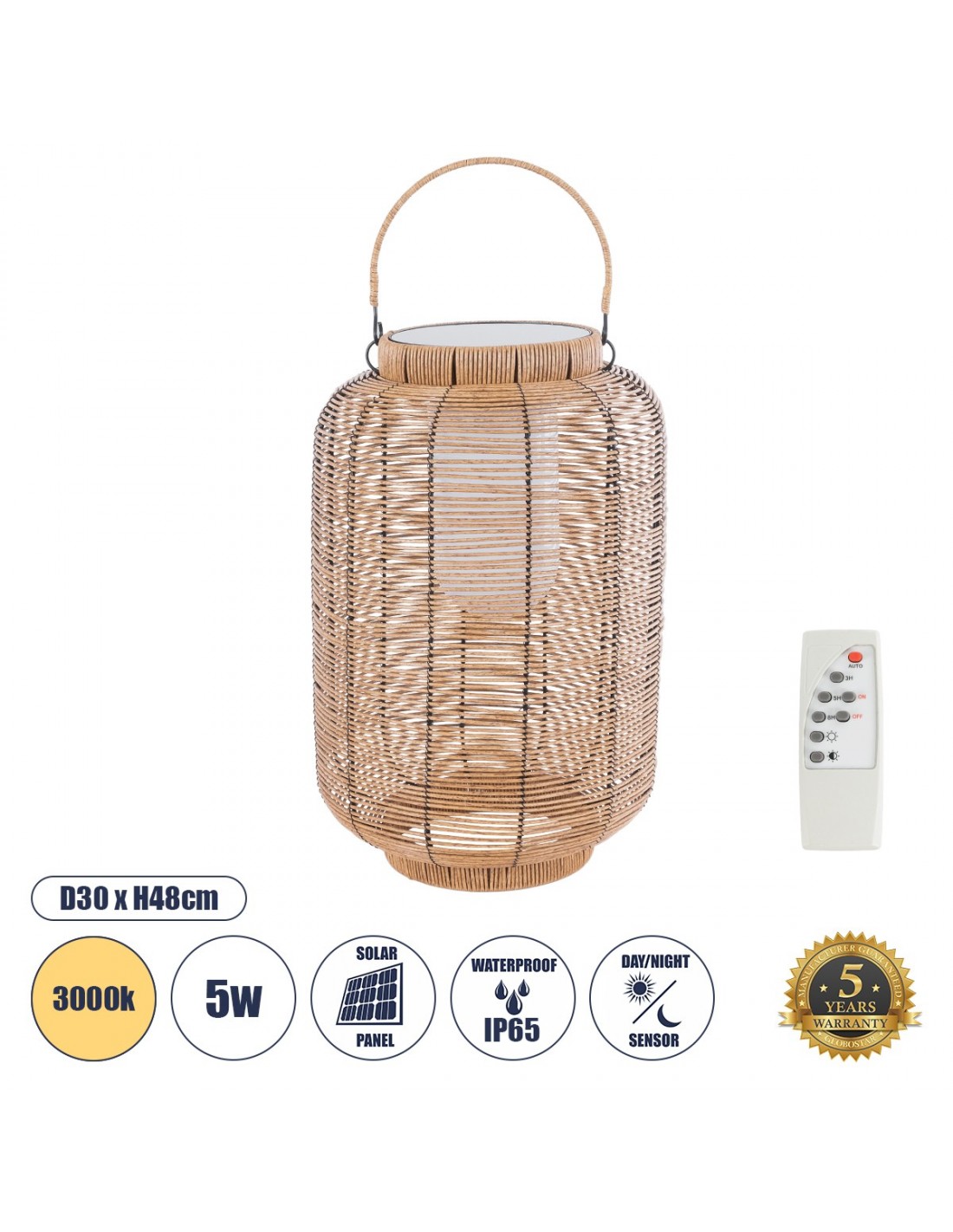 GloboStar® GRAMBIAN 02304 Boho Αυτόνομο Ηλιακό Κρεμαστό/Επιτραπέζιο Φωτιστικό Φαναράκι LED SMD 5W 200lm - Φ30 x Υ48cm - με Ενσωματωμένη Μπαταρία 600mAh - Φωτοβολταϊκό Πάνελ και Αισθητήρα Ημέρας-Νύχτας με Ασύρματο Χειριστήριο IR Μπεζ Μπαμπού Αδιάβροχο IP65 Θερμό Λευκό 3000K