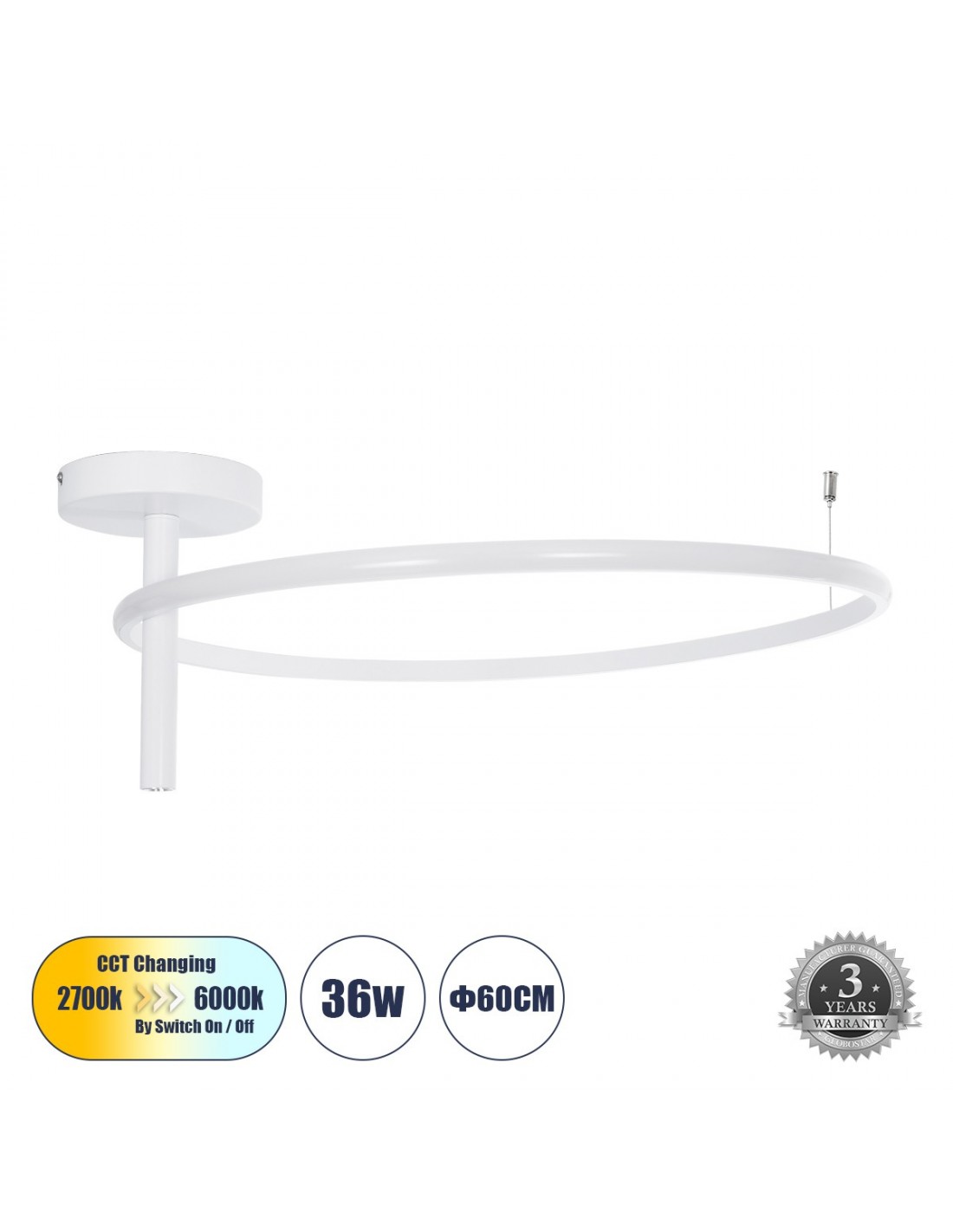 GloboStar® VERONA 61224 Φωτιστικό Οροφής Δαχτυλίδι-Κύκλος LED CCT 36W 4032lm 360° AC 220-240V - Εναλλαγή Φωτισμού μέσω Διακόπτη On/Off All In One Ψυχρό 6000k+Φυσικό 4500k+Θερμό 2700K Φ60 x Υ23cm - Λευκό - 3 Χρόνια Εγγύηση