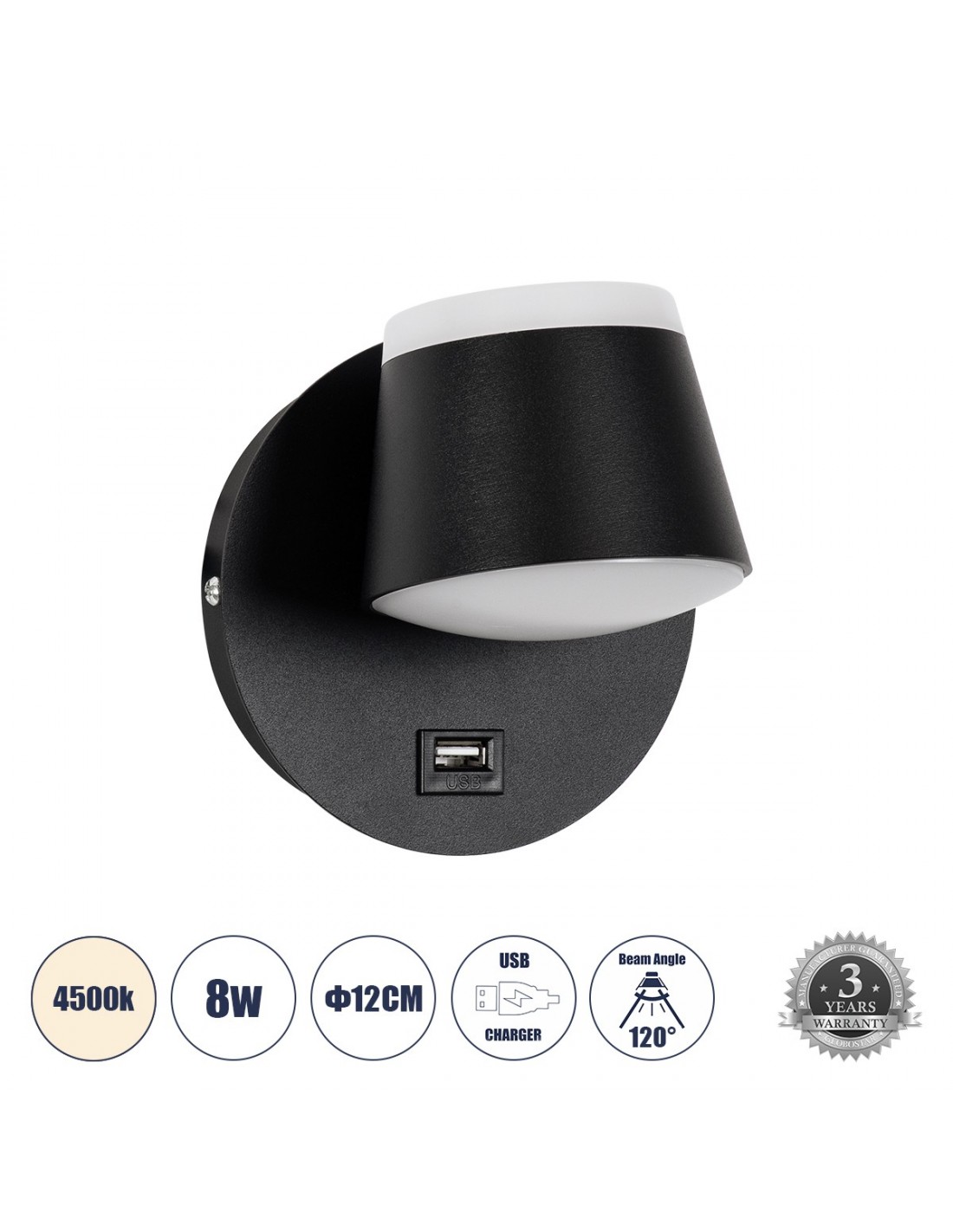 GLOBOSTAR® REGENCY 61373 Μοντέρνο Φωτιστικό Τοίχου - Απλίκα Ξενοδοχείου Reading Light με Φορτιστή USB 3A LED 8W 920lm 120° AC 220-240V IP20 Φυσικό Λευκό 4500K - Bridgelux SMD Chip & TÜV SÜD Driver - Μαύρο Ματ - Μ12 x Π12 x Υ13cm - 3 Χρόνια Εγγύηση