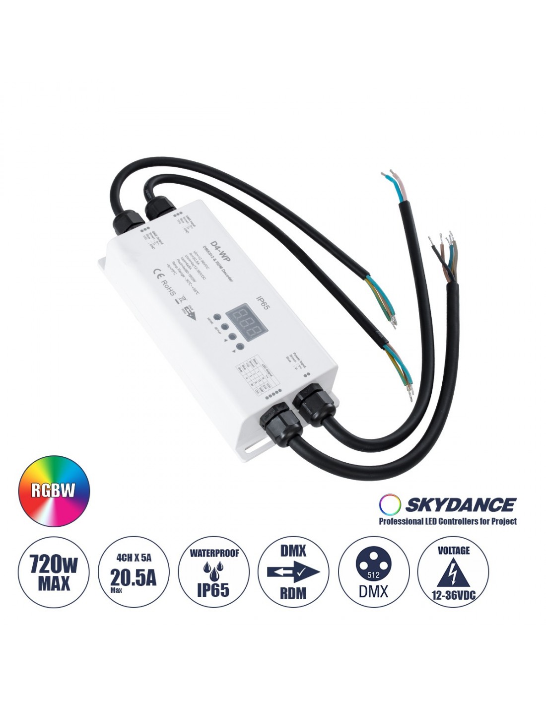 GloboStar® 71571-IP65 D4-WP SKYDANCE DC DMX & RDM Dimmer High Speed Controller / Decoder 4 Καναλιών DC 12-36V 4 x 5A 180W - Max 20.5A 720W - Αδιάβροχος IP65 Μ17 x Π8 x Υ4cm - 5 Years Warranty