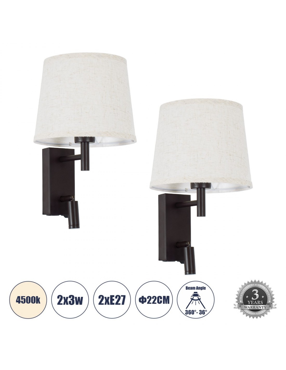 GLOBOSTAR® ROULETTE-R 61381 Μοντέρνο Φωτιστικό Τοίχου - Απλίκα Ξενοδοχείου Reading Light με Φορτιστή USB 3A & Ντουί 1 x E27 LED 3W 360lm 36° & 360° AC 220-240V IP20 Φυσικό Λευκό 4500K - Bridgelux COB Chip & TÜV SÜD Driver - Καφέ & Μπεζ - Μ22 x Π23.5 x Υ37cm - Σετ 2 Τεμαχίων - 3 Χρόνια Εγγύηση