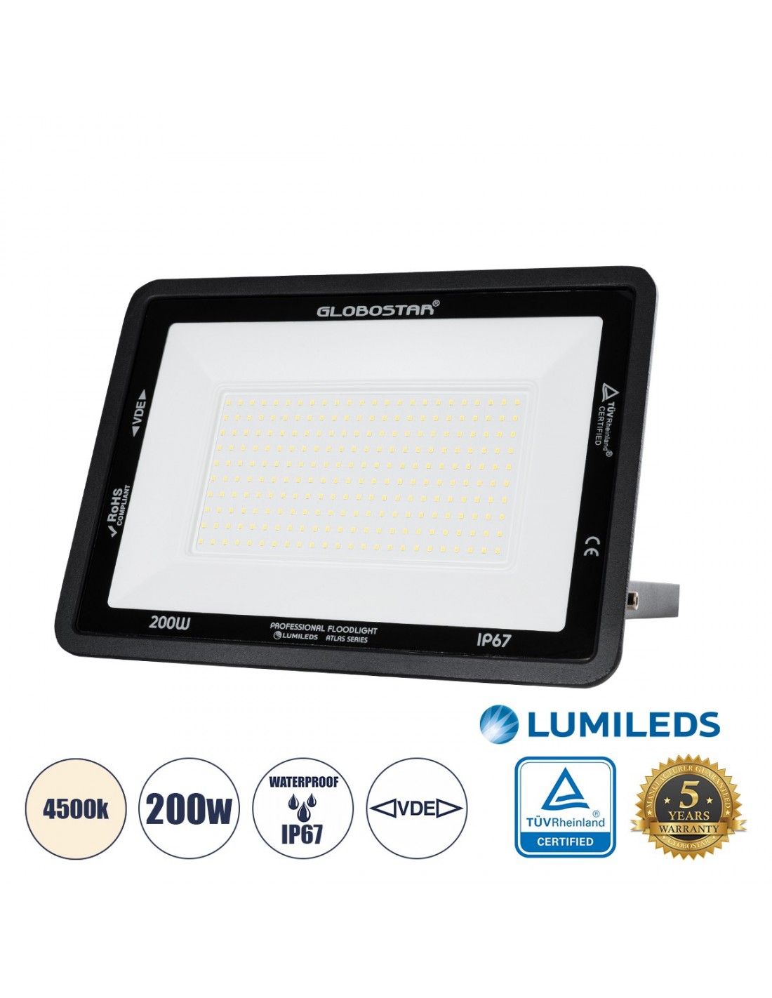 GLOBOSTAR® ATLAS 61432 Προβολέας LED 200W 24000lm 120° AC 220-240V Αδιάβροχο IP67 Φυσικό Λευκό 4500K - Lumileds SMD Chip - TÜV Rheinland Certified - Μαύρο Ματ - Μ38 x Π4 x Υ28cm - 5 Χρόνια Εγγύηση