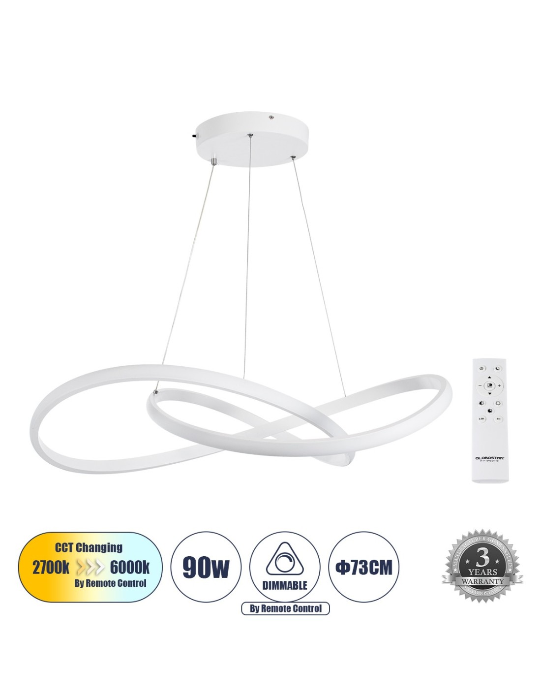 GLOBOSTAR® DEXTER 60914 Μοντέρνο Κρεμαστό Φωτιστικό Οροφής LED 90W 10080lm 300° AC 220-240V IP20 Ρυθμιζόμενο Λευκό CCT με Χειριστήριο από 2700K έως 6000K Dimmable - Lumileds SMD Chip - Λευκό Ματ - Μ73 x Π73 x Υ16cm - 3 Χρόνια Εγγύηση