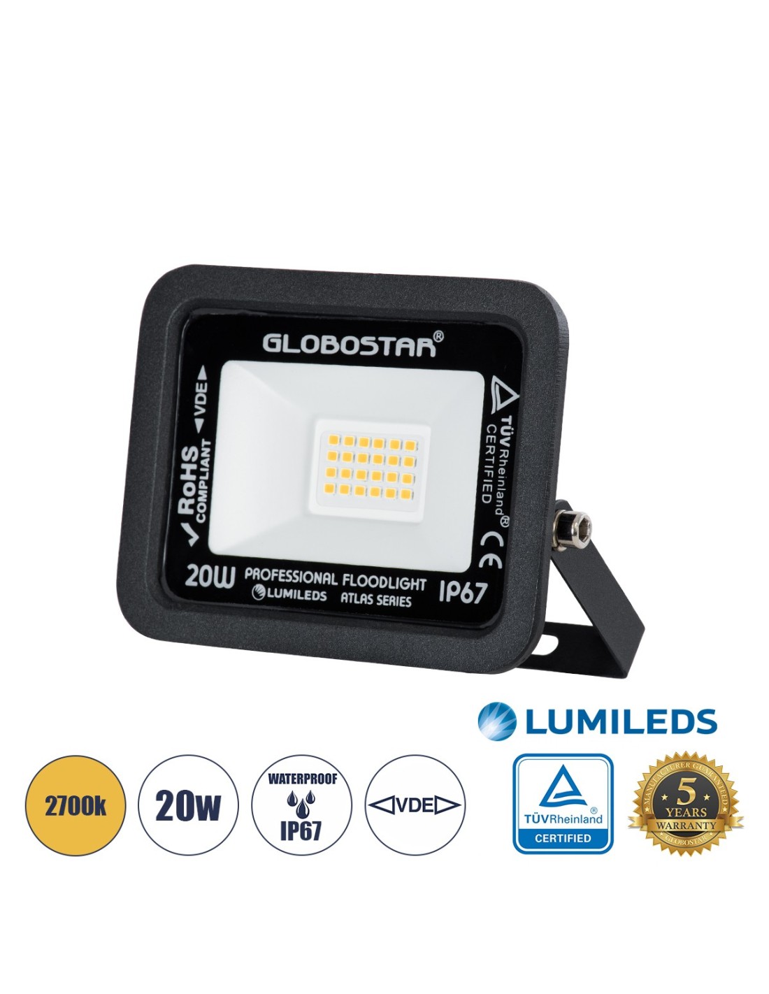 GLOBOSTAR® ATLAS 61412 Προβολέας LED 20W 2300lm 120° AC 220-240V Αδιάβροχο IP67 Θερμό Λευκό Ματ 2700K - Lumileds SMD Chip - TÜV Rheinland Certified - Μαύρο Ματ - Μ12 x Π2.5 x Υ9.5cm - 5 Χρόνια Εγγύηση