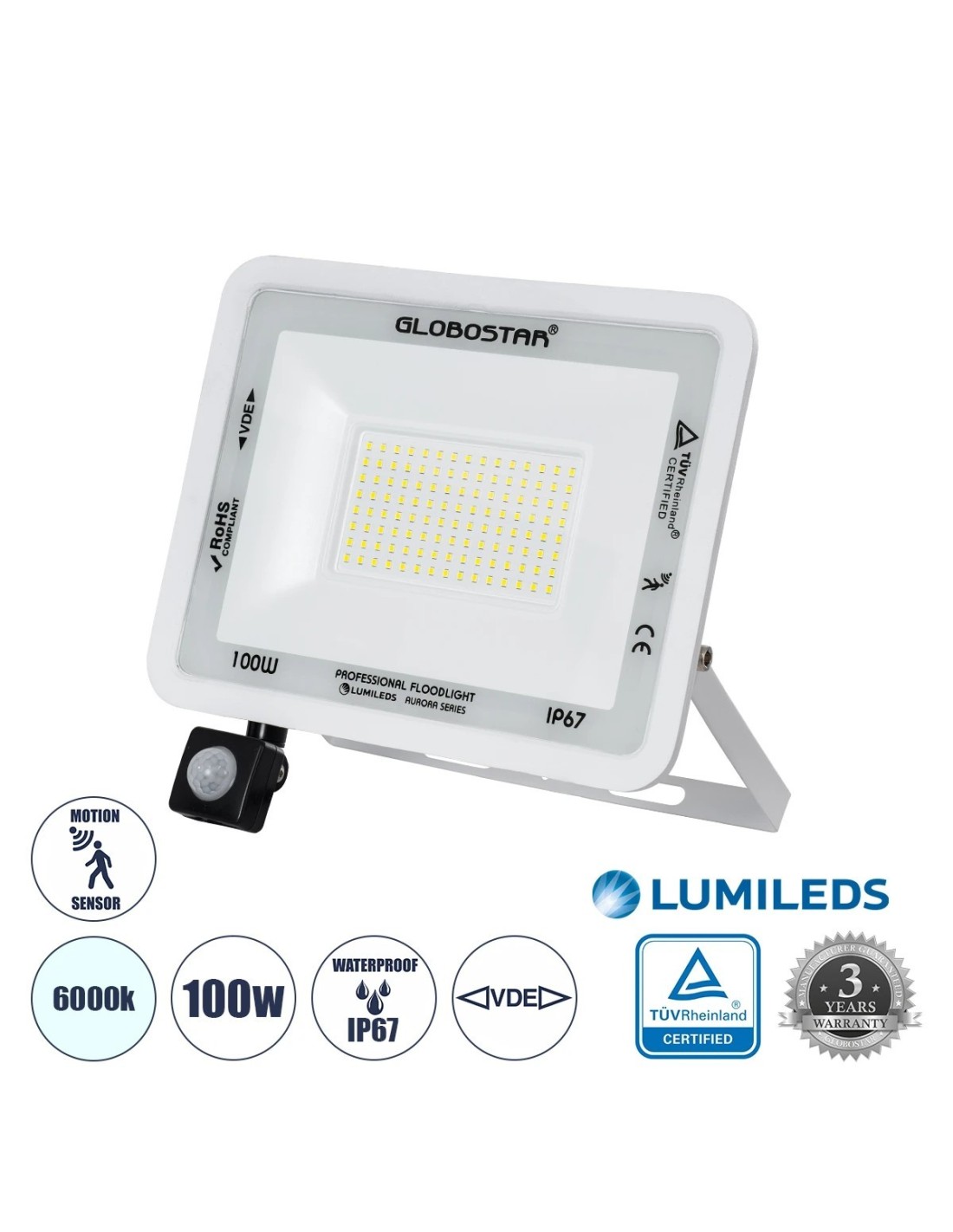 GLOBOSTAR® AURORA 61444 Προβολέας με Ανιχνευτή PIR / Αισθητήρα Κίνησης LED 100W 12500lm 120° AC 220-240V Αδιάβροχο IP67 Ψυχρό Λευκό 6000K - Lumileds SMD Chip - TÜV Rheinland Certified - Λευκό Ματ - Μ25 x Π6.5 x Υ27.5cm - 3 Χρόνια Εγγύηση