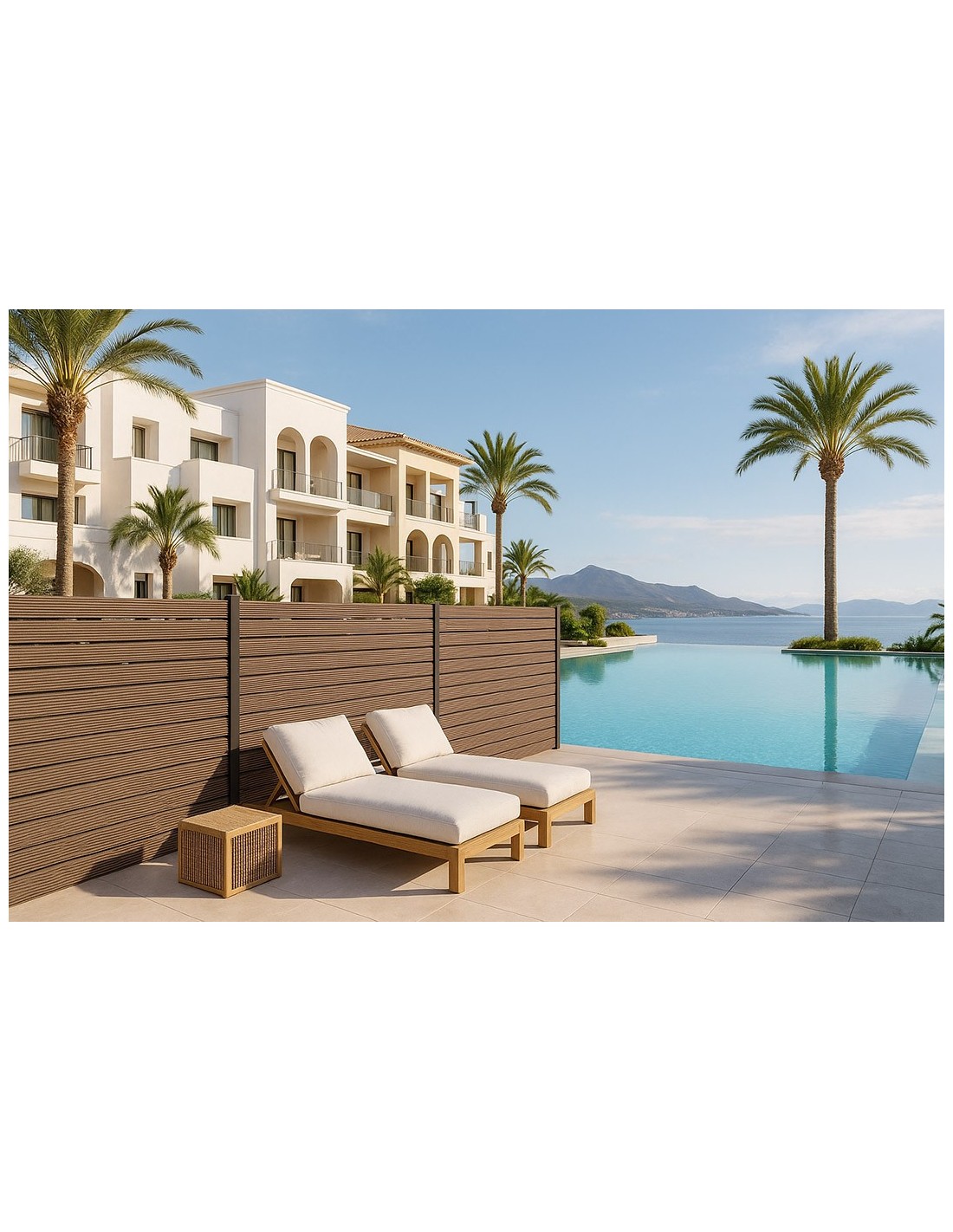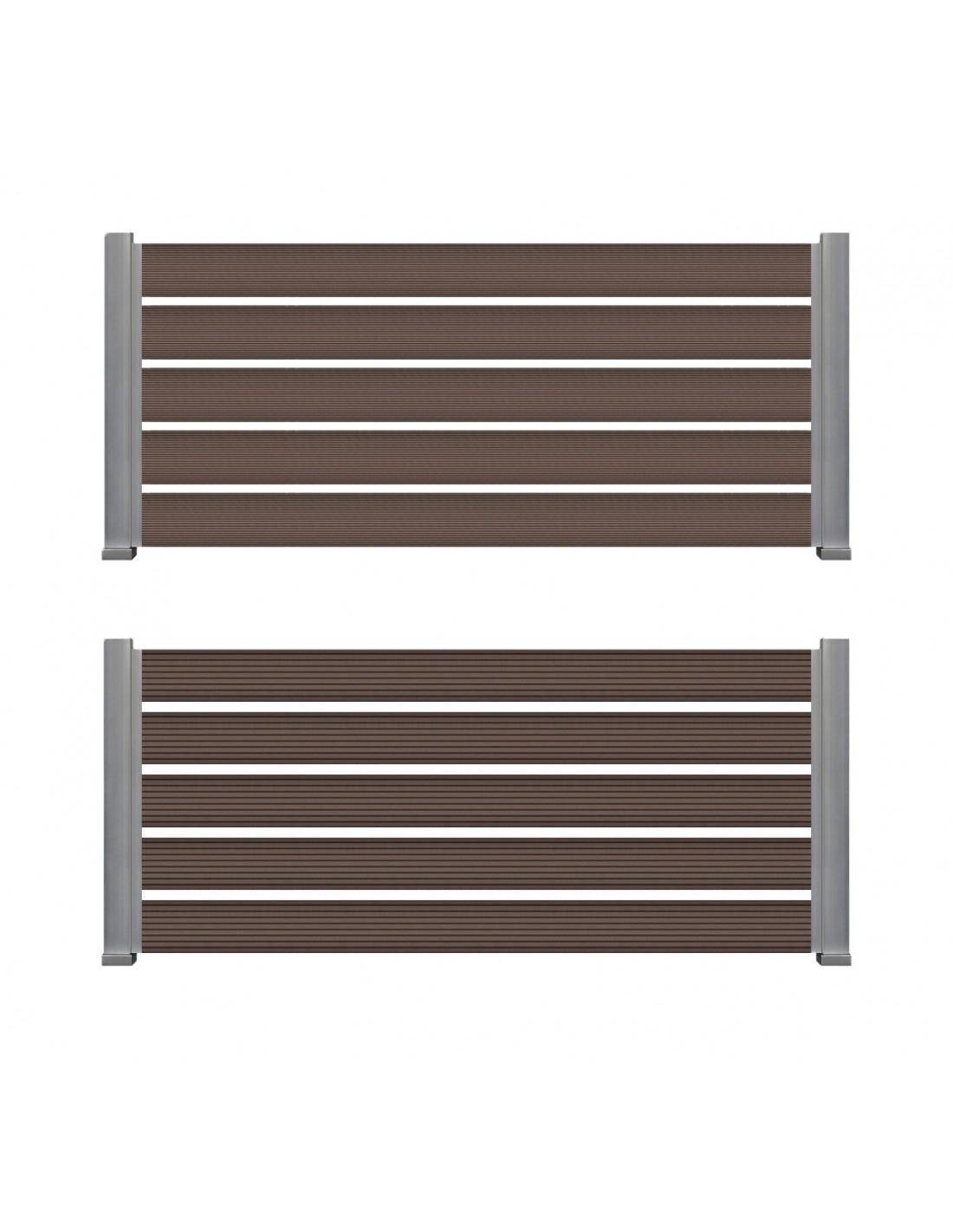 Συνθετικό Deck WPC περίφραξης εξωτερικού χώρου που αποτελείται από 55% ξύλο και 35% HDPE και 10% ρητίνες, UV σταθεροποιητές κλπ. Είναι διπλής όψης με στενό χτένι στη μία όψη και φαρδύ στην άλλη. Η περίφραξη με WPC έχει προσιτή τιμή και είναι κατάλληλη για πολλές εφαρμογές όπως περίφραξη οικοπέδου, κήπου ή πισίνας, εξωτερική περίφραξη, επένδυση τοίχου, φράχτη, αυλόπορτας κτλ.